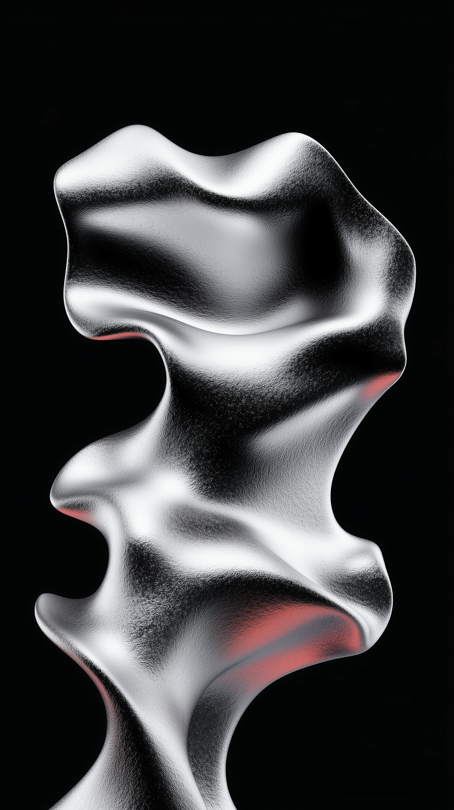 Abstract metallic sculpture with fluid curves and reflective silver surface, accented by subtle red highlights on a black background.