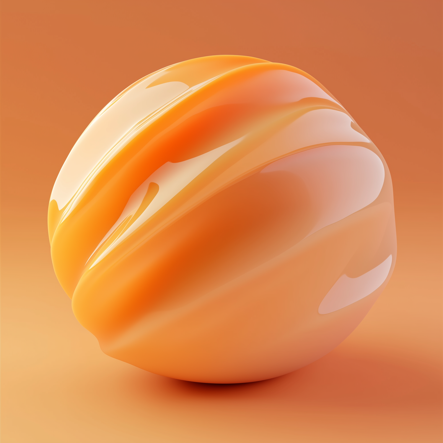 A glossy orange 3D sphere with flowing textures and light reflections, set against a soft orange gradient background.