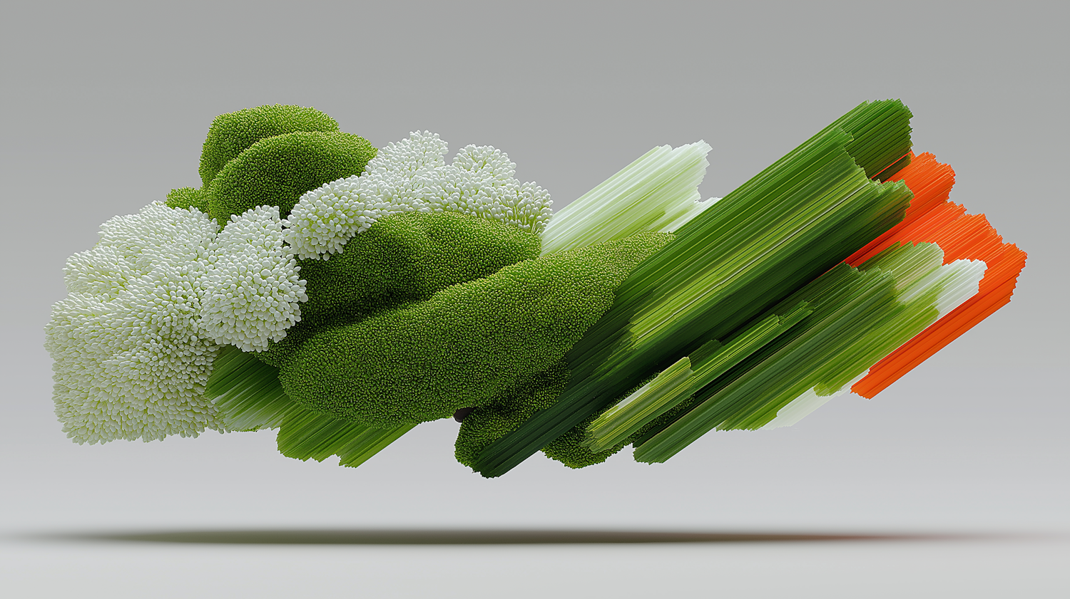 Abstract composition with green and white textured spheres and linear green and orange elements on a neutral gradient background.