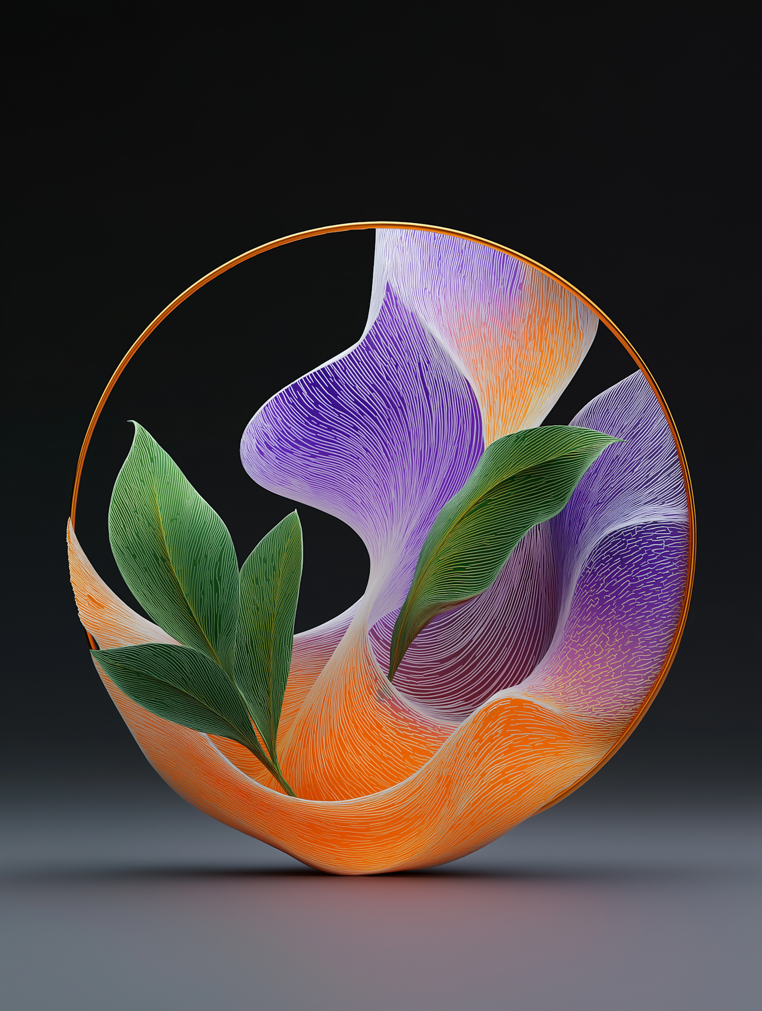 A stunning abstract artwork with flowing orange and purple textures, accented by green leaves, set against a dark gradient background.