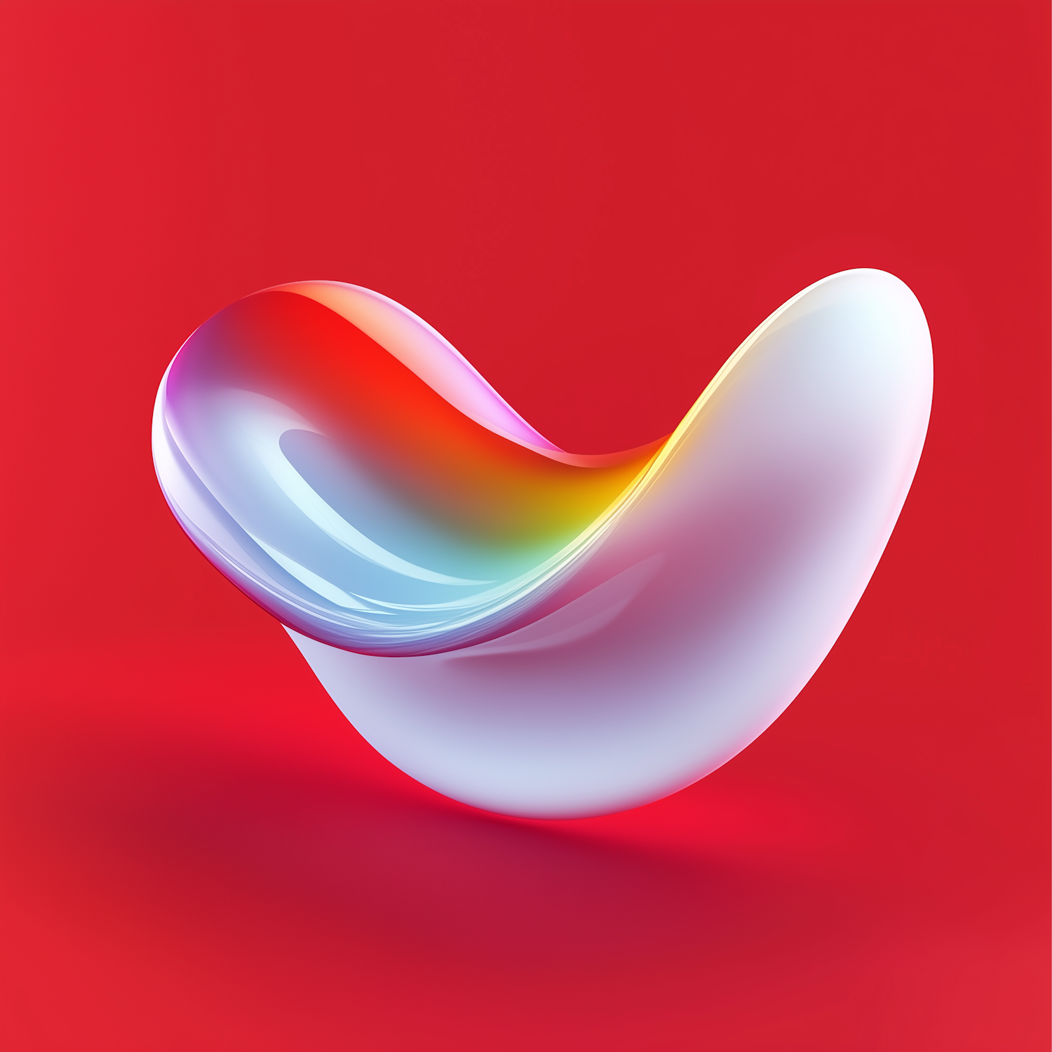 A sleek 3D abstract design with a rainbow gradient on a glossy, curved shape against a bold red background. Modern and vibrant.