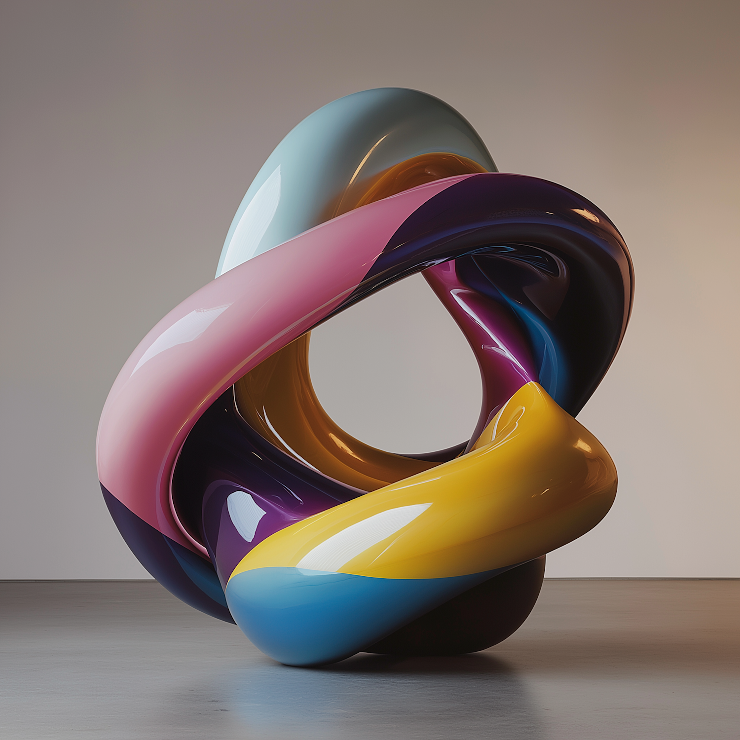 Vibrant abstract sculpture with glossy loops in pink, blue, yellow, and purple, set against a minimalist background.