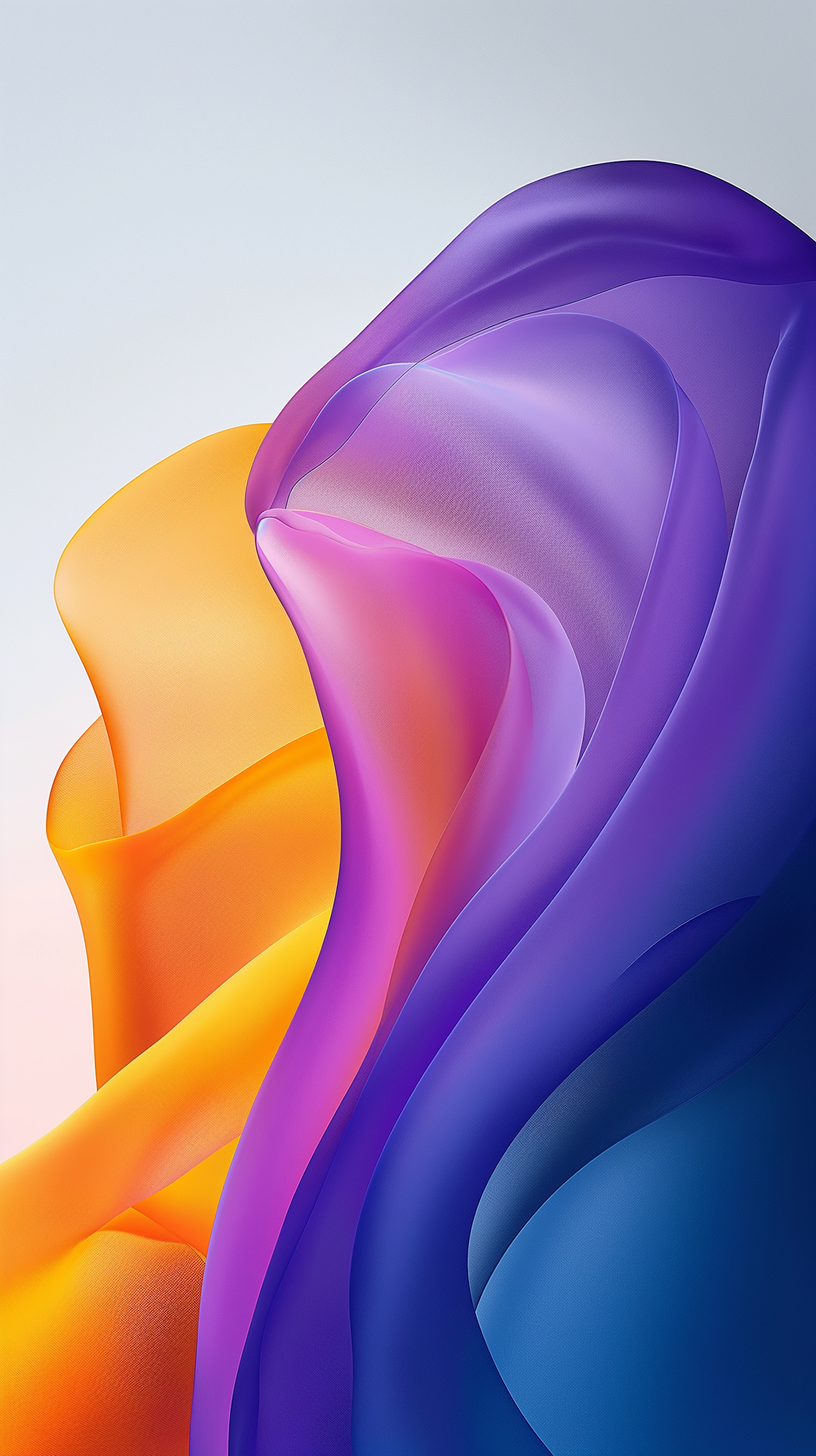 Vibrant abstract design with flowing shapes in purple, blue, and orange hues, creating a dynamic and elegant visual.