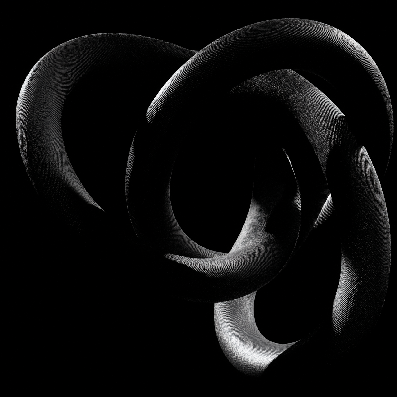 Abstract 3D rendering of intertwined black toroidal shapes with textured surfaces, illuminated against a dark background.