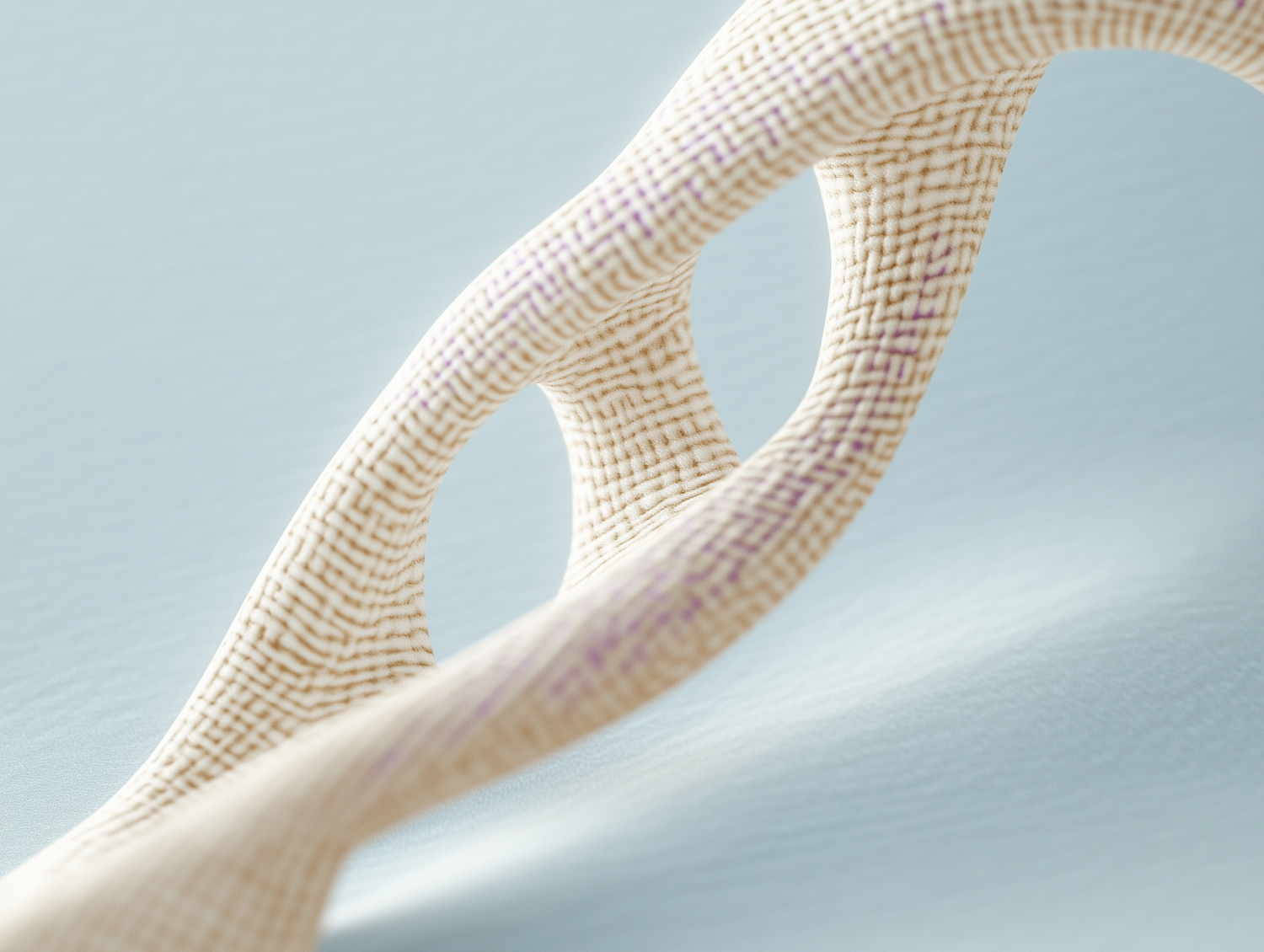 Close-up of a woven, cream-colored abstract structure with purple accents on a soft blue background, creating a minimalistic and artistic vibe.