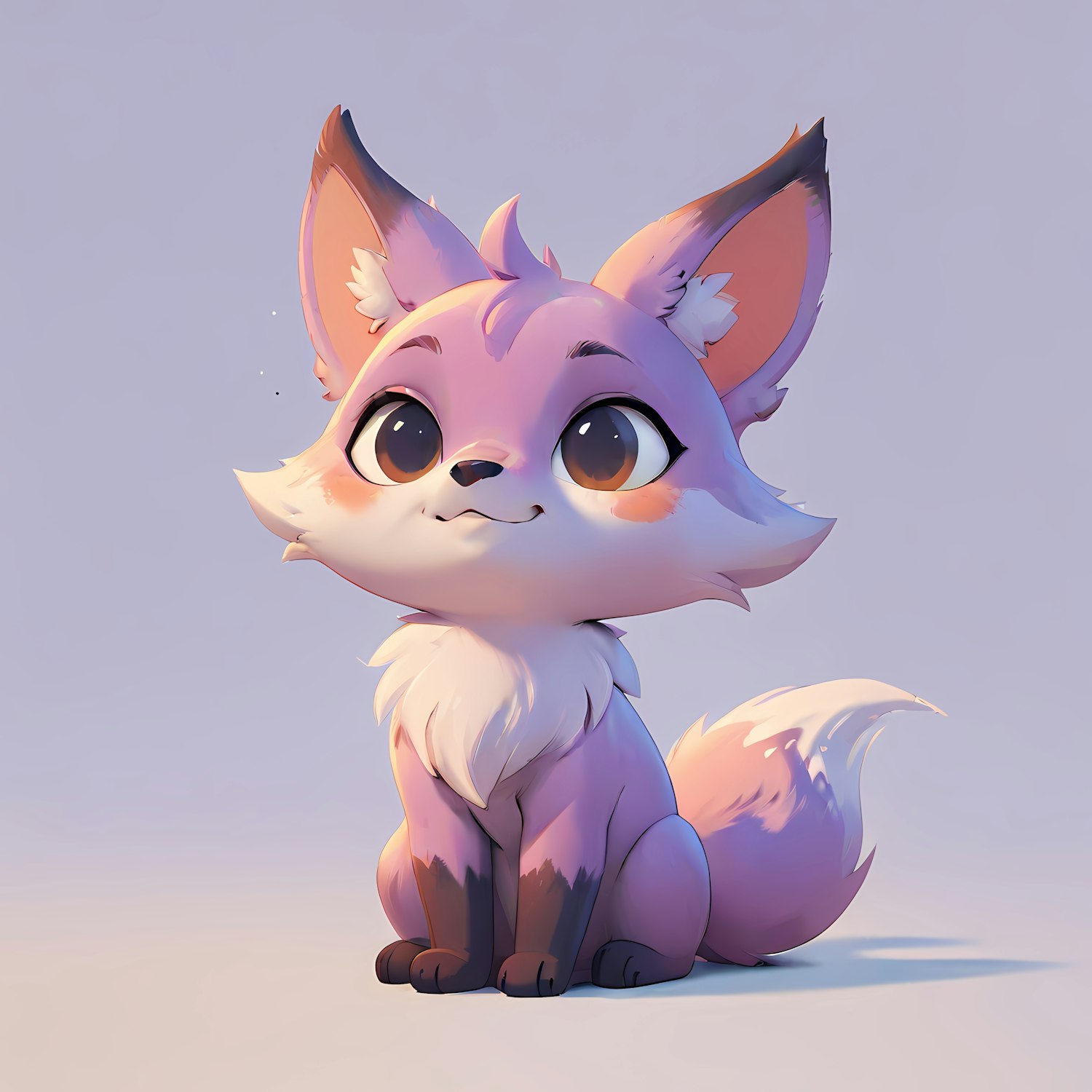 Adorable cartoon fox with pink and white fur, large brown eyes, and a fluffy tail, sitting cheerfully against a light background.