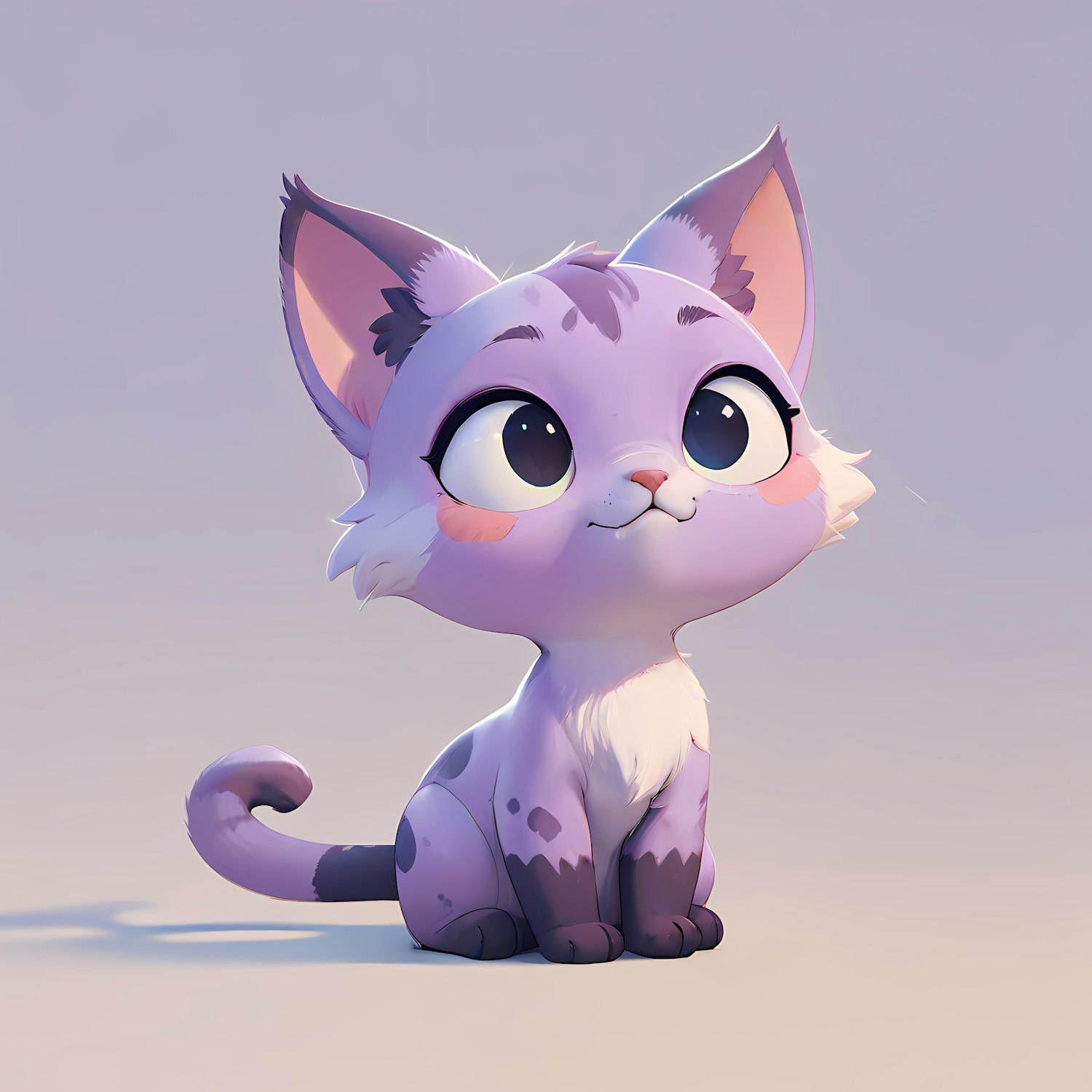 Adorable cartoon kitten with purple fur and big eyes, sitting with a curious expression. Perfect for fans of cute and whimsical art.