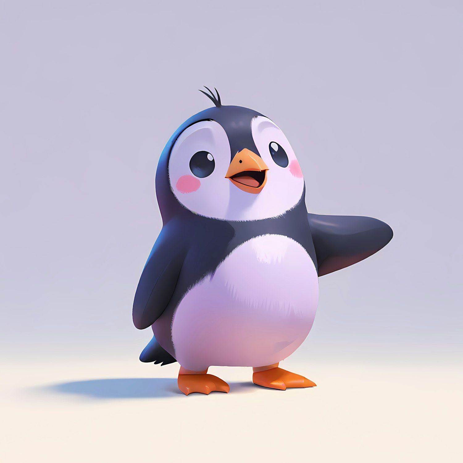 Adorable cartoon penguin with expressive eyes and a cheerful pose, set against a soft gradient background.