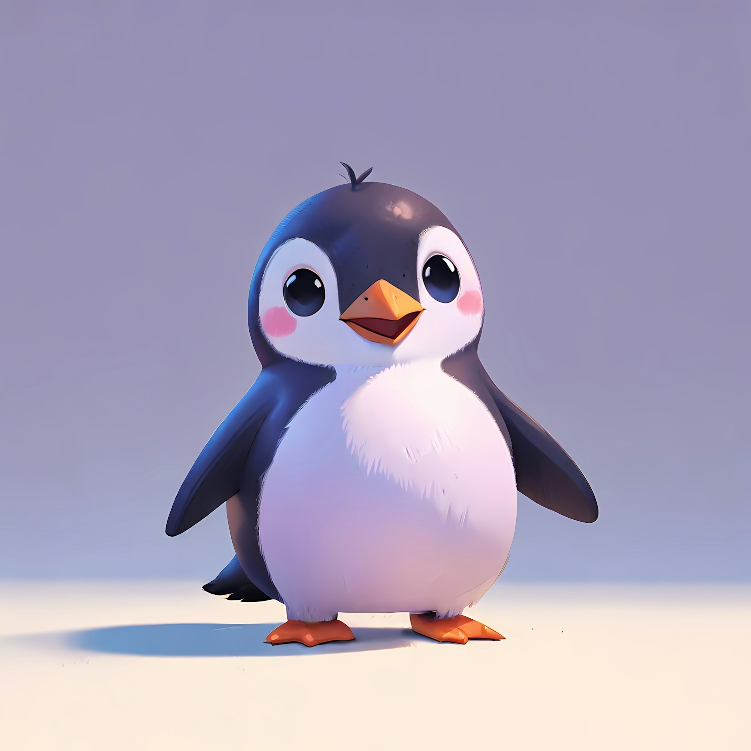 Adorable cartoon penguin with big eyes and a cute blush, set against a soft gradient background.