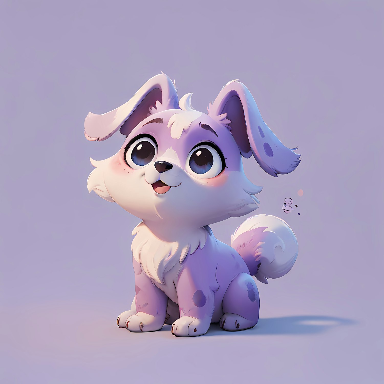 Adorable cartoon puppy with purple fur and big eyes on a soft purple background, exuding charm and playfulness.