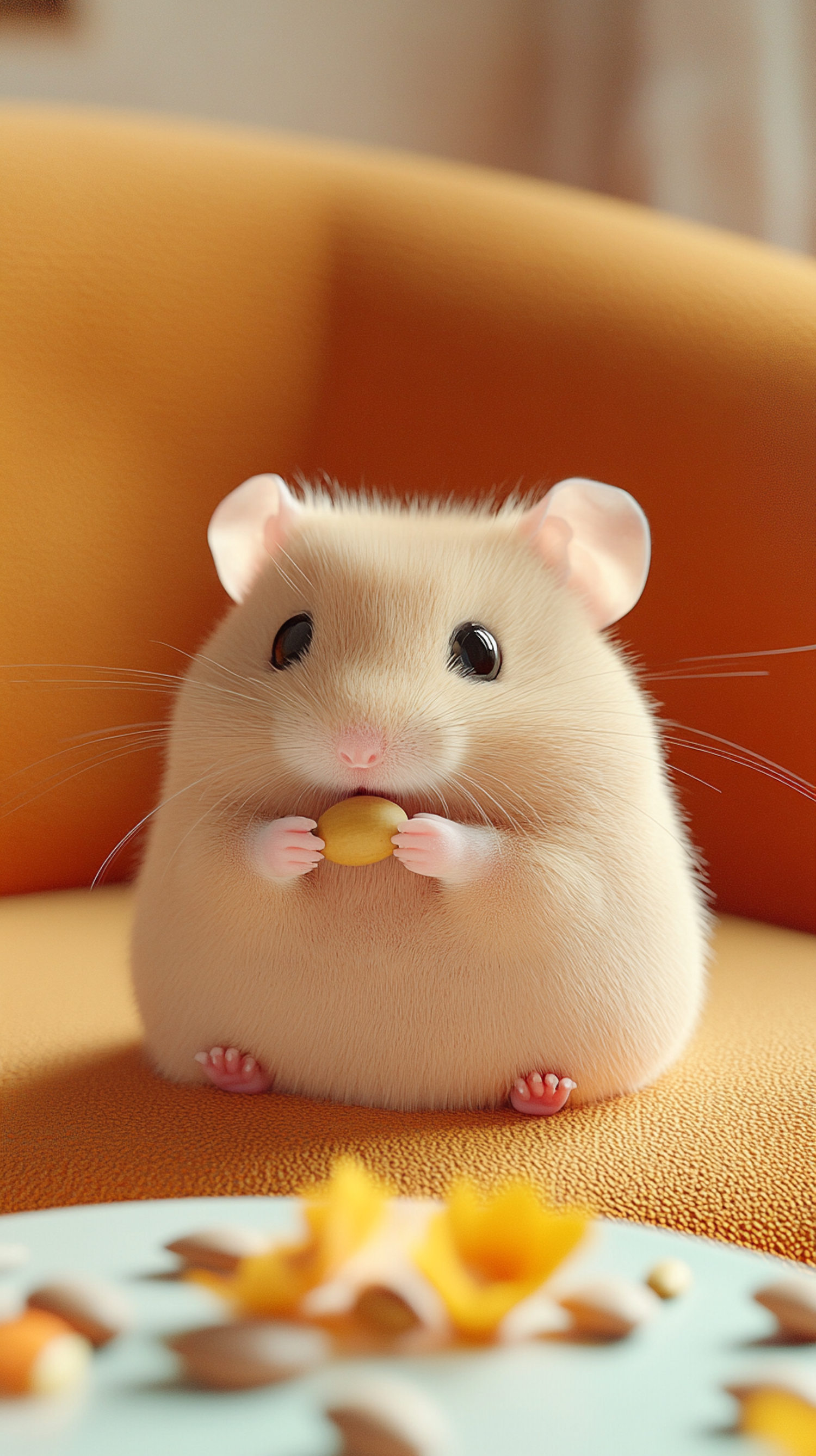 Adorable fluffy hamster with big eyes holding a seed, sitting on an orange surface with scattered seeds around.