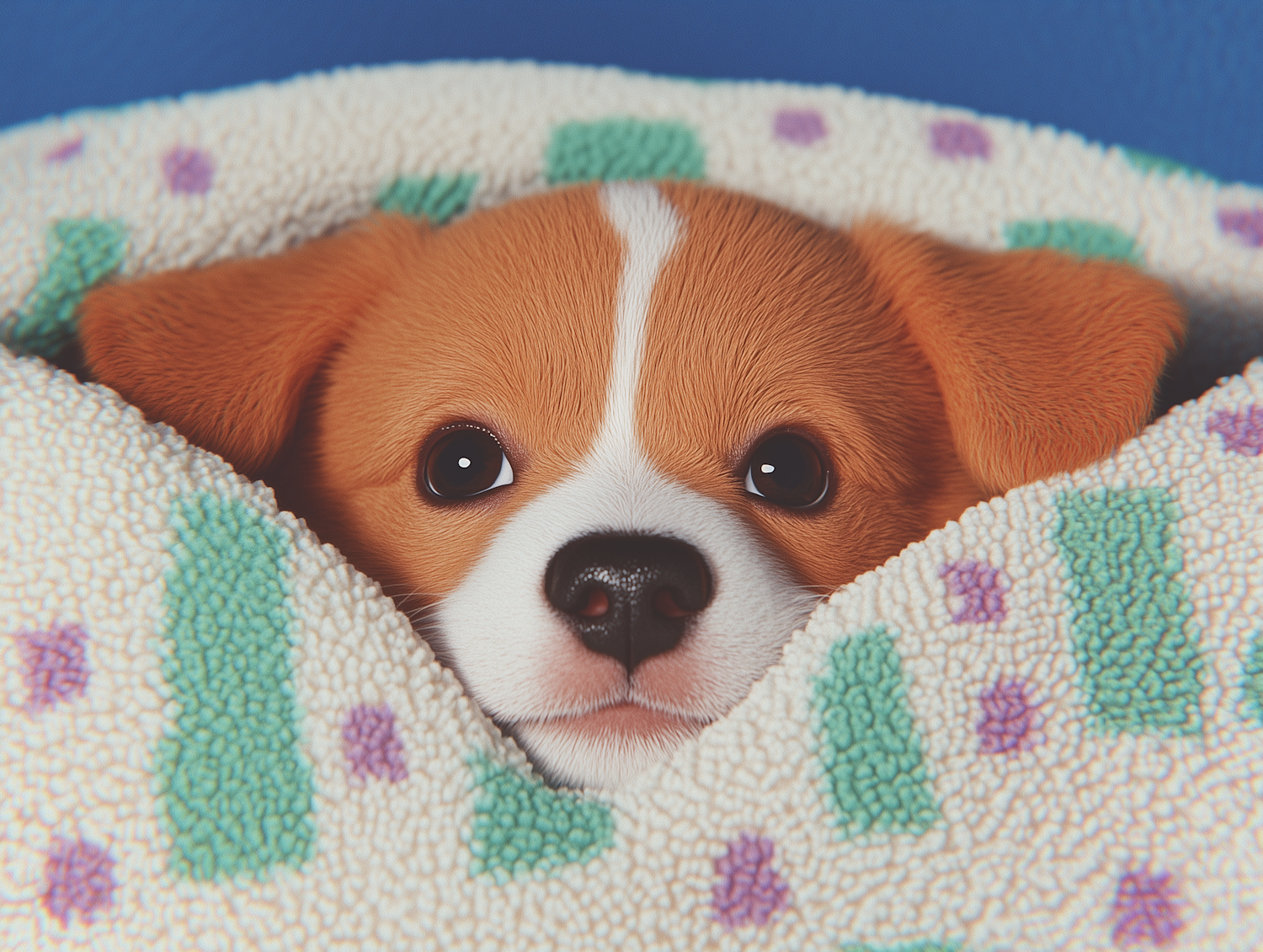 Adorable puppy with big eyes peeking from a cozy blanket with colorful patterns, set against a calming blue background.