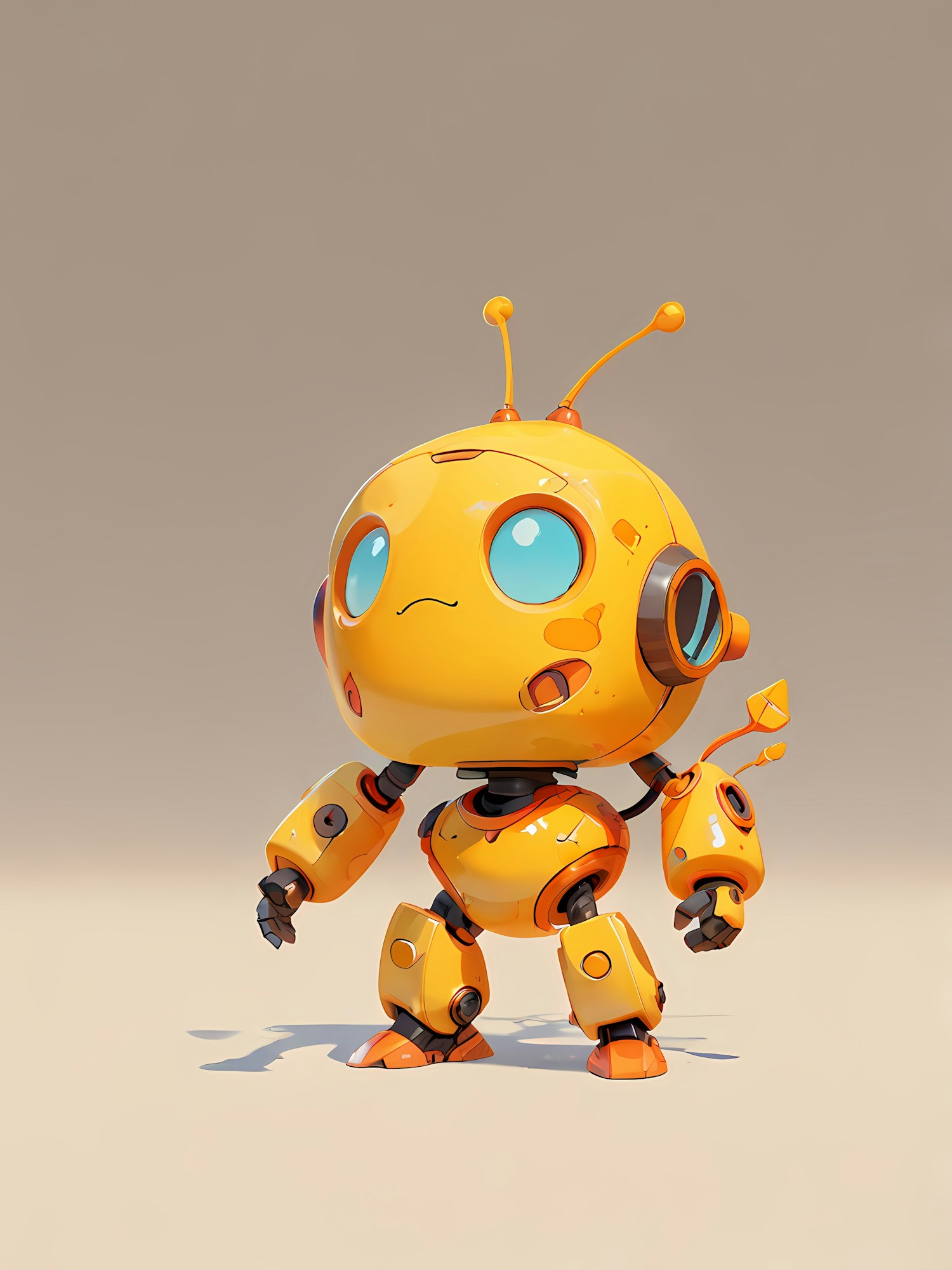 Adorable yellow robot with big blue eyes, antennae, and a curious pose. Perfect for sci-fi or futuristic design inspiration.
