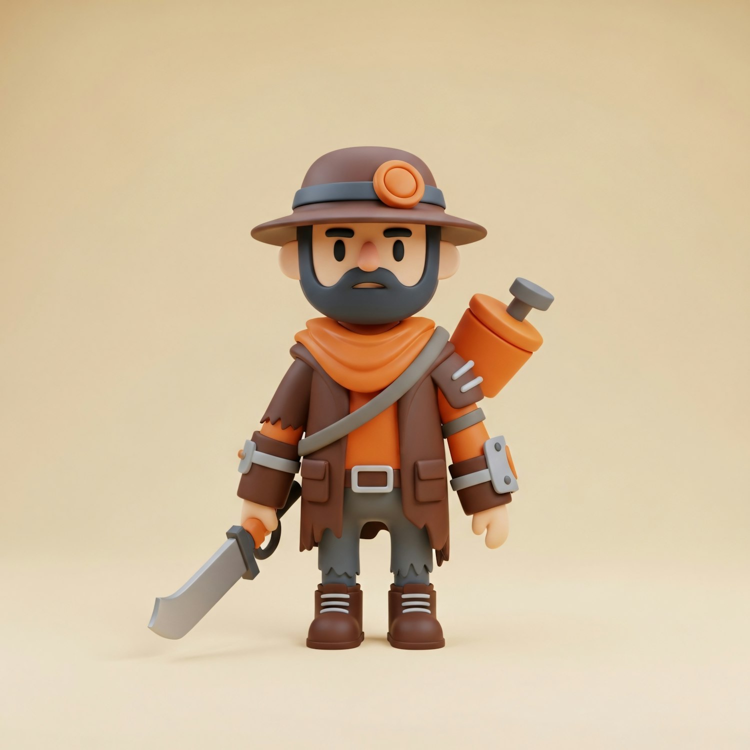 A 3D-rendered adventurer character with a sword and rugged outfit, featuring a cartoonish and vibrant design against a plain background.