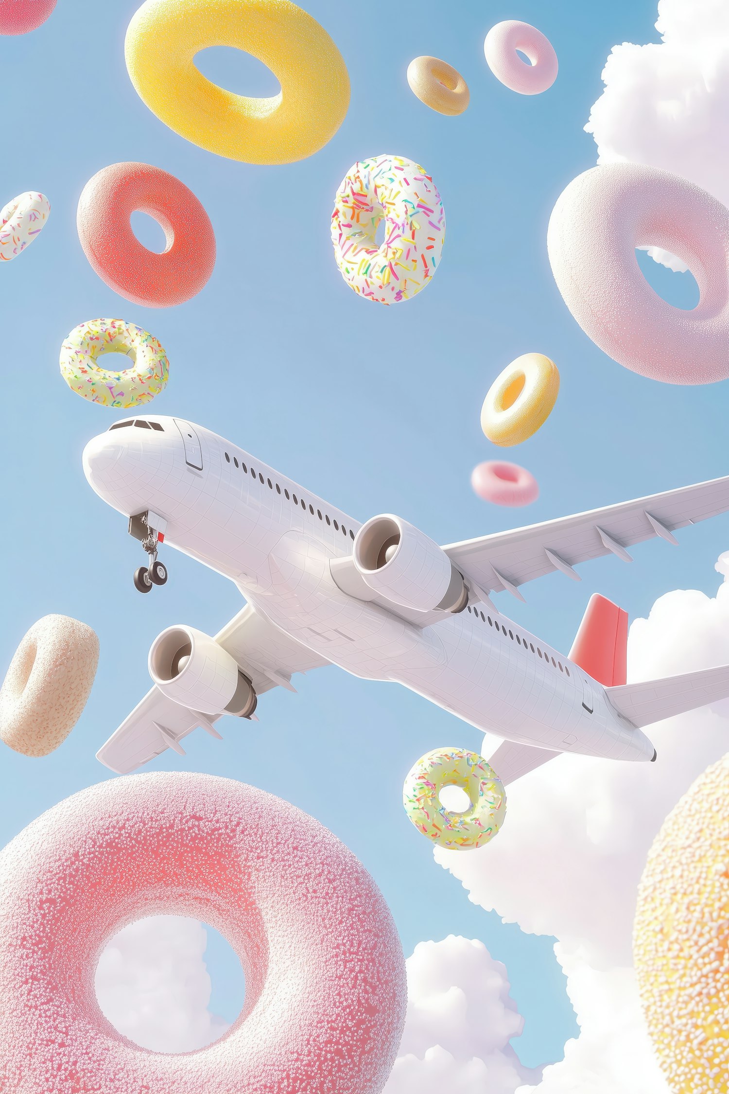 A whimsical airplane soars through a sky filled with colorful, oversized donuts and fluffy clouds, creating a surreal and playful scene.