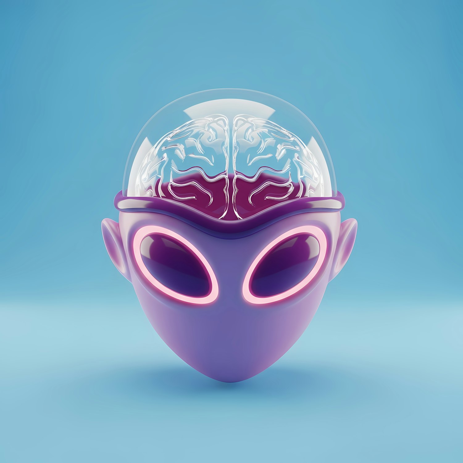 Futuristic 3D alien head with a transparent dome revealing a brain, glowing eyes, and a sleek purple design on a blue background.