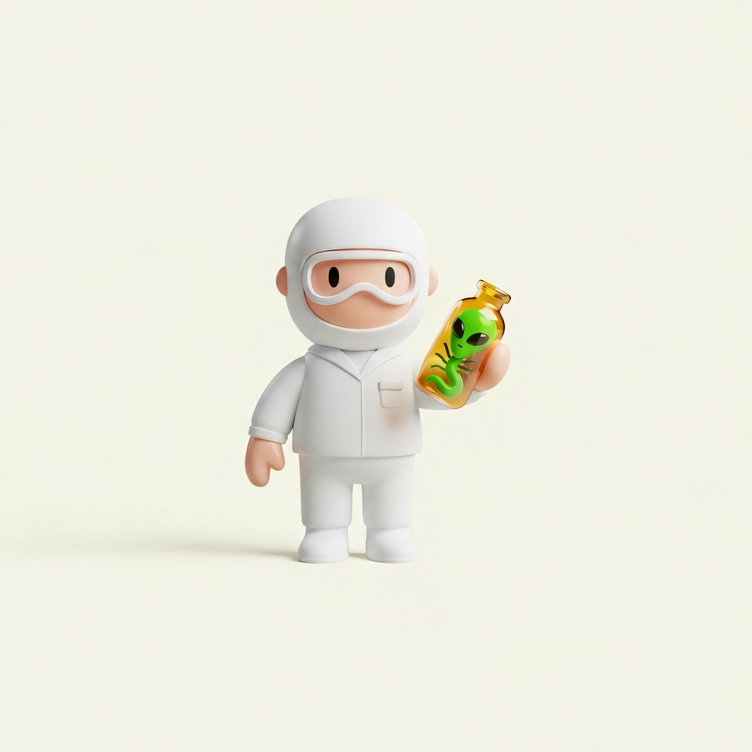 A cute cartoon figure in a white suit holds a jar with a green alien inside, set against a plain light background.