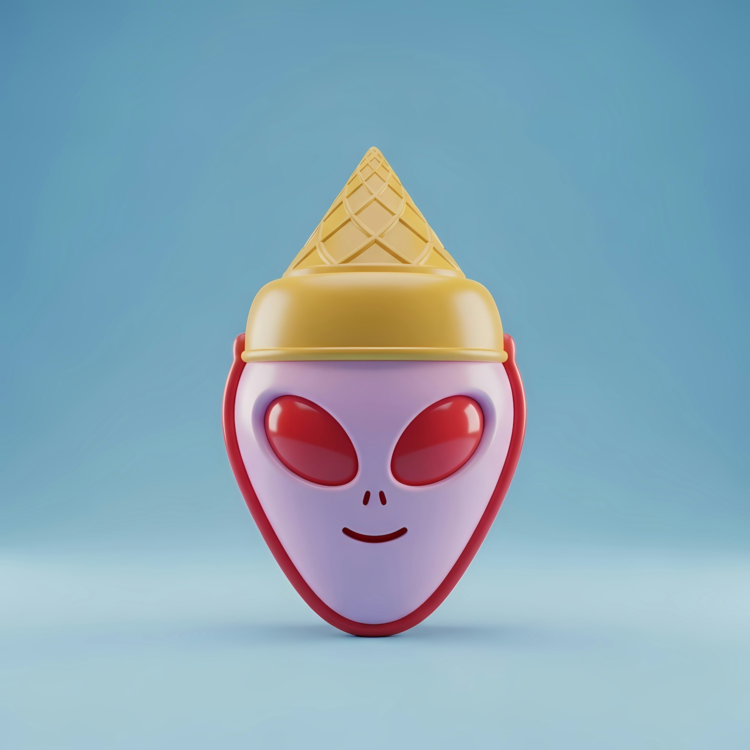 A fun 3D illustration of a smiling alien face with a yellow ice cream cone hat, set against a light blue background.