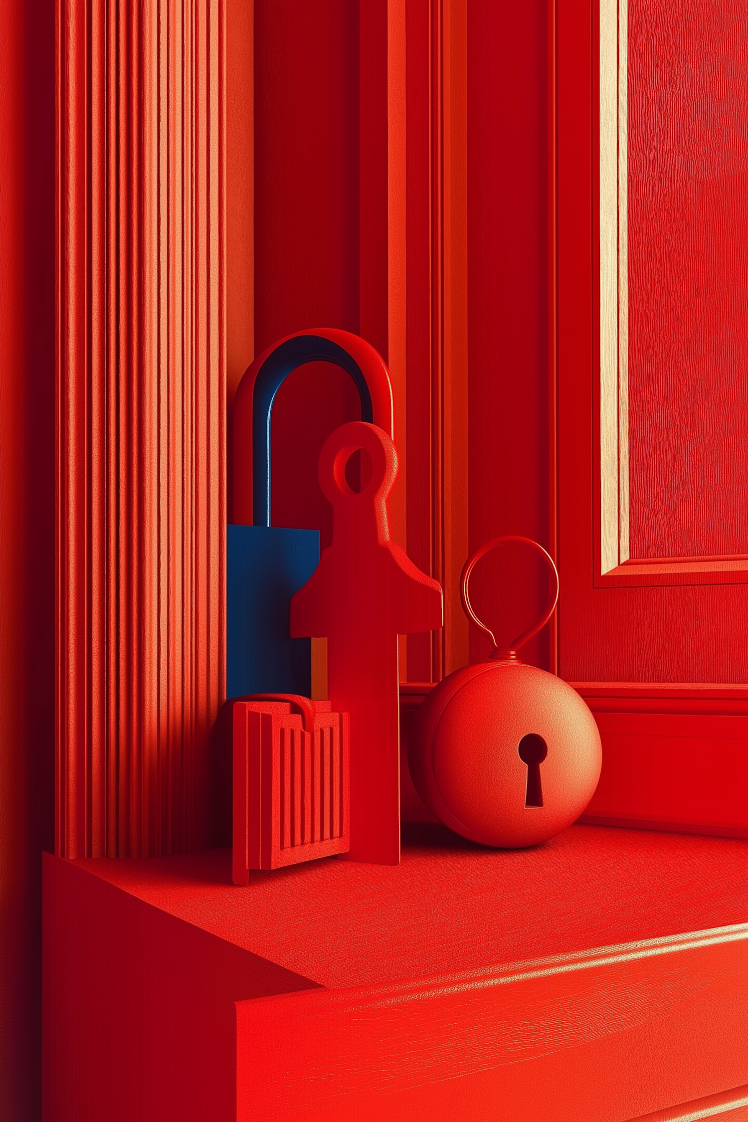Bold red and blue lock and key elements in a striking geometric arrangement against a textured red background.