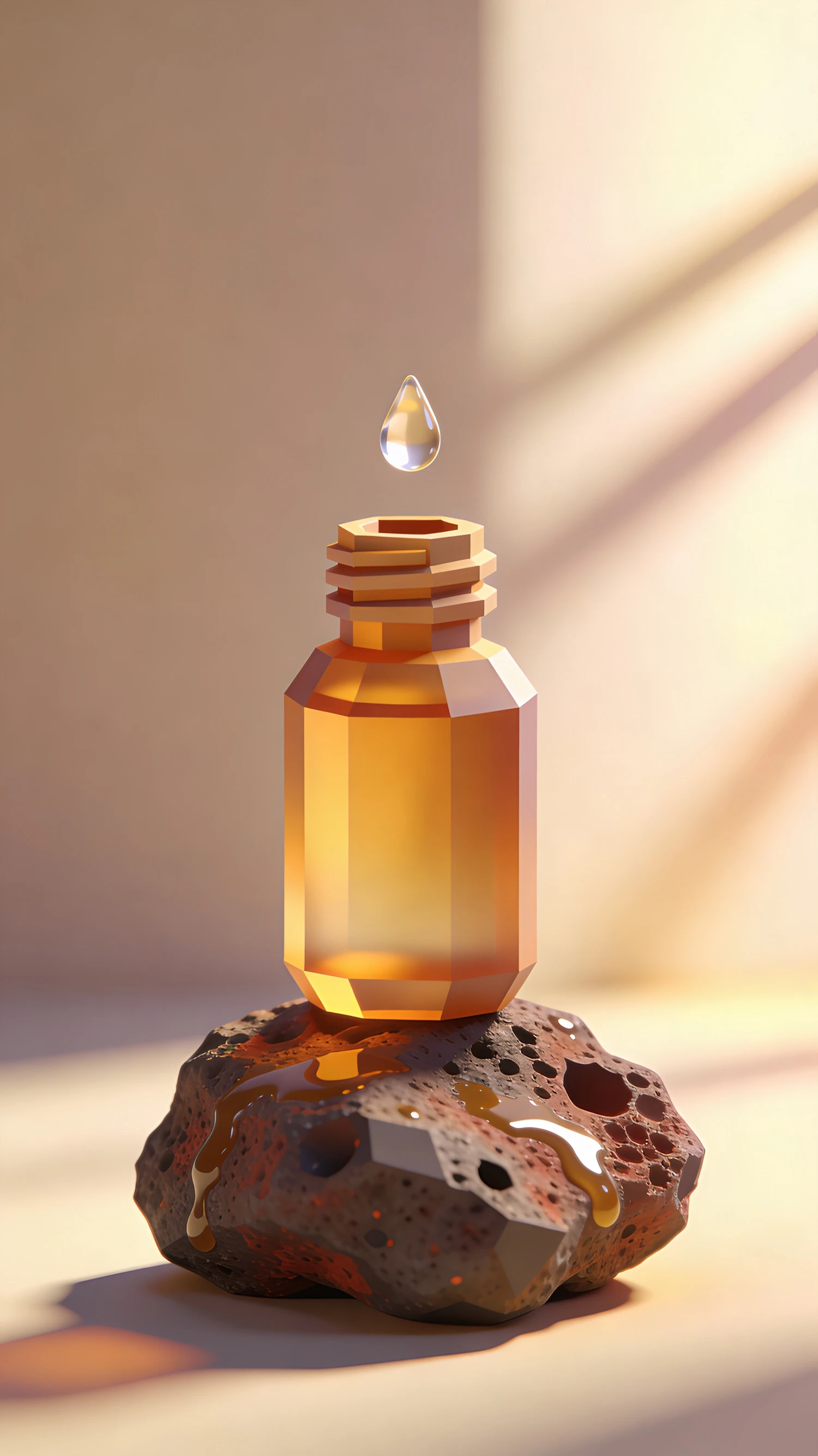 A 3D-rendered amber bottle on a volcanic rock with a droplet above, set in warm lighting with a minimalist background.