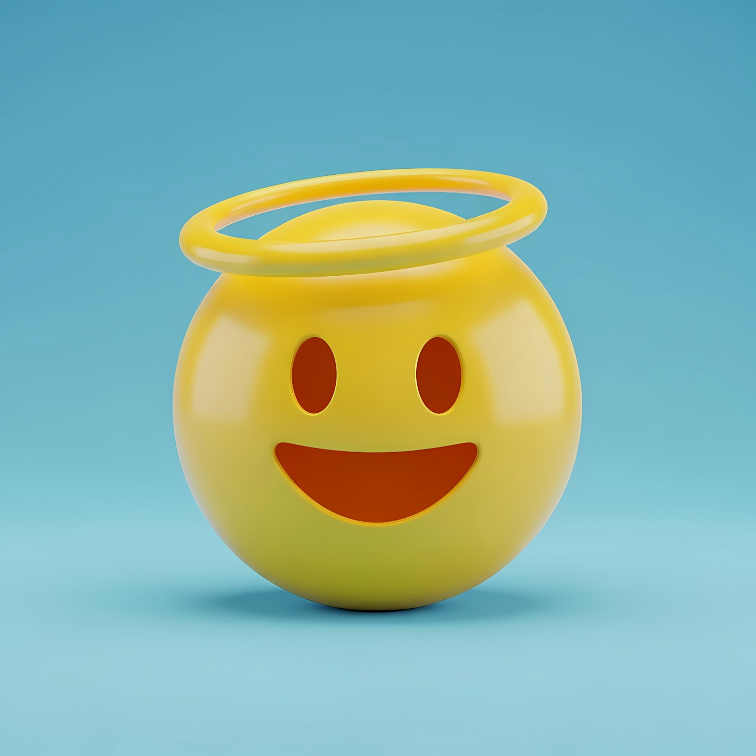 A 3D-rendered yellow smiley face emoji with a halo, set against a light blue background, symbolizing innocence and cheerfulness.