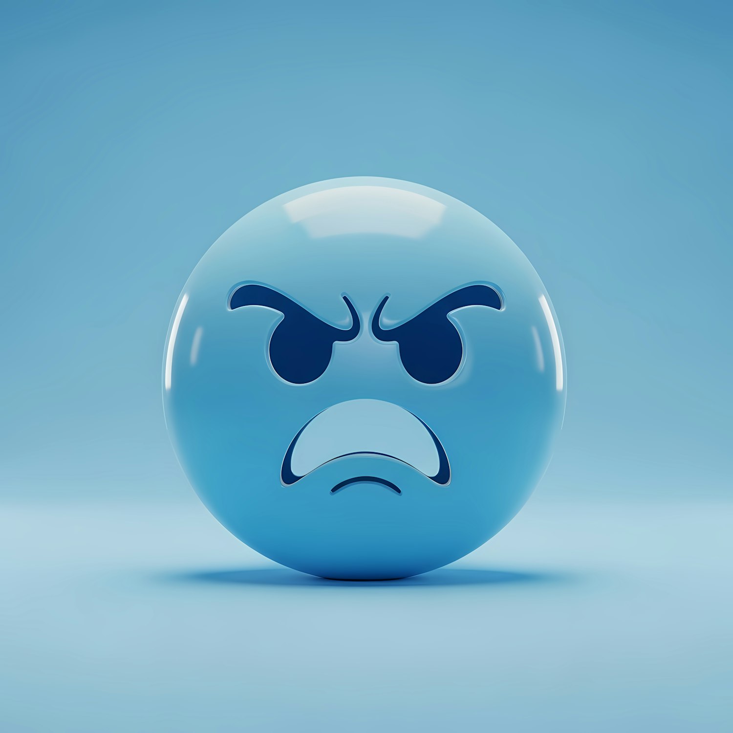 3D-rendered blue emoji with an angry expression, featuring furrowed brows and a frown, set against a matching blue background.