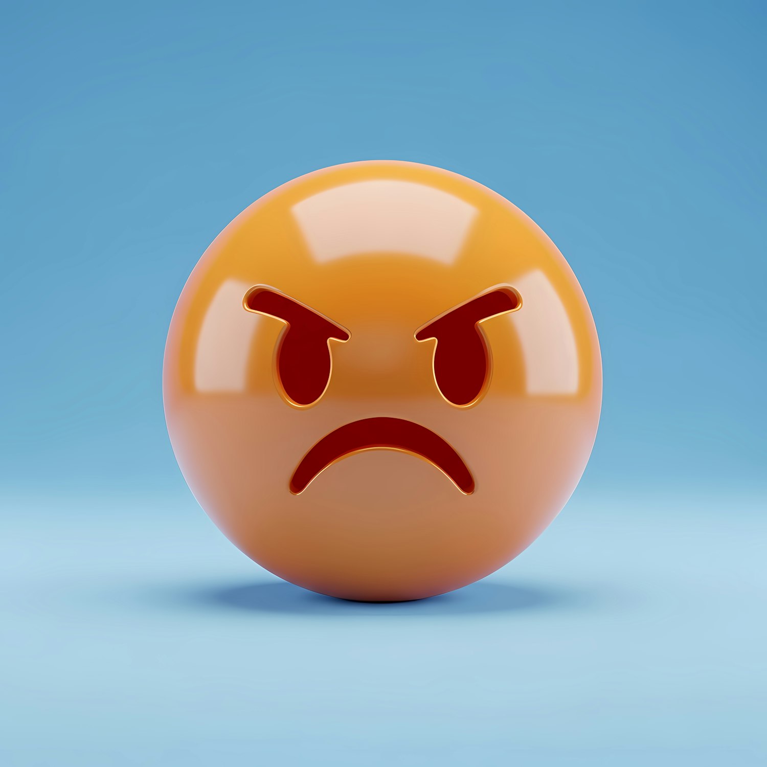 3D-rendered orange angry emoji with furrowed brows and a frown, set against a clean blue background. Perfect for expressing frustration.