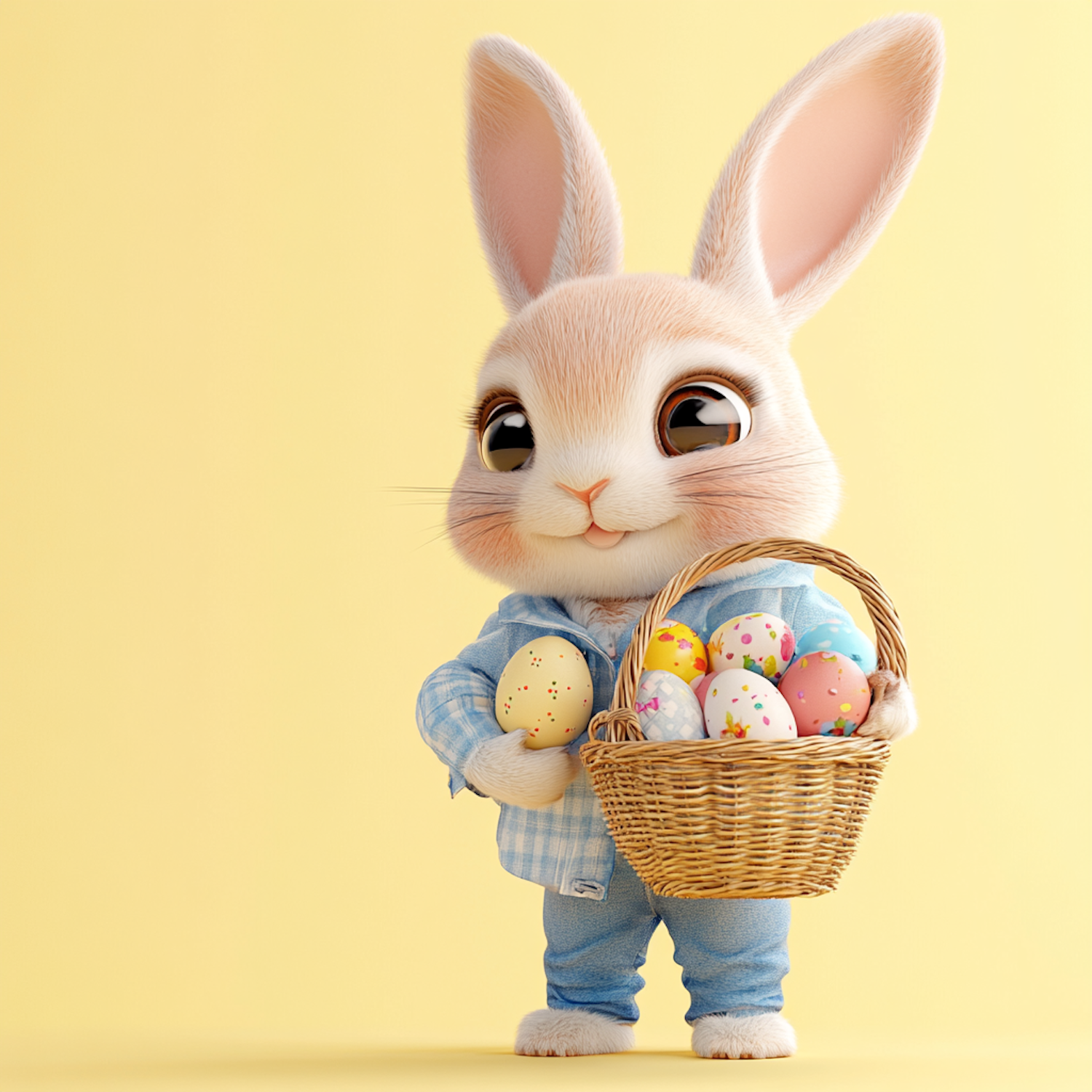 Adorable animated bunny in blue outfit holding a basket of colorful Easter eggs, set against a cheerful pastel yellow background.