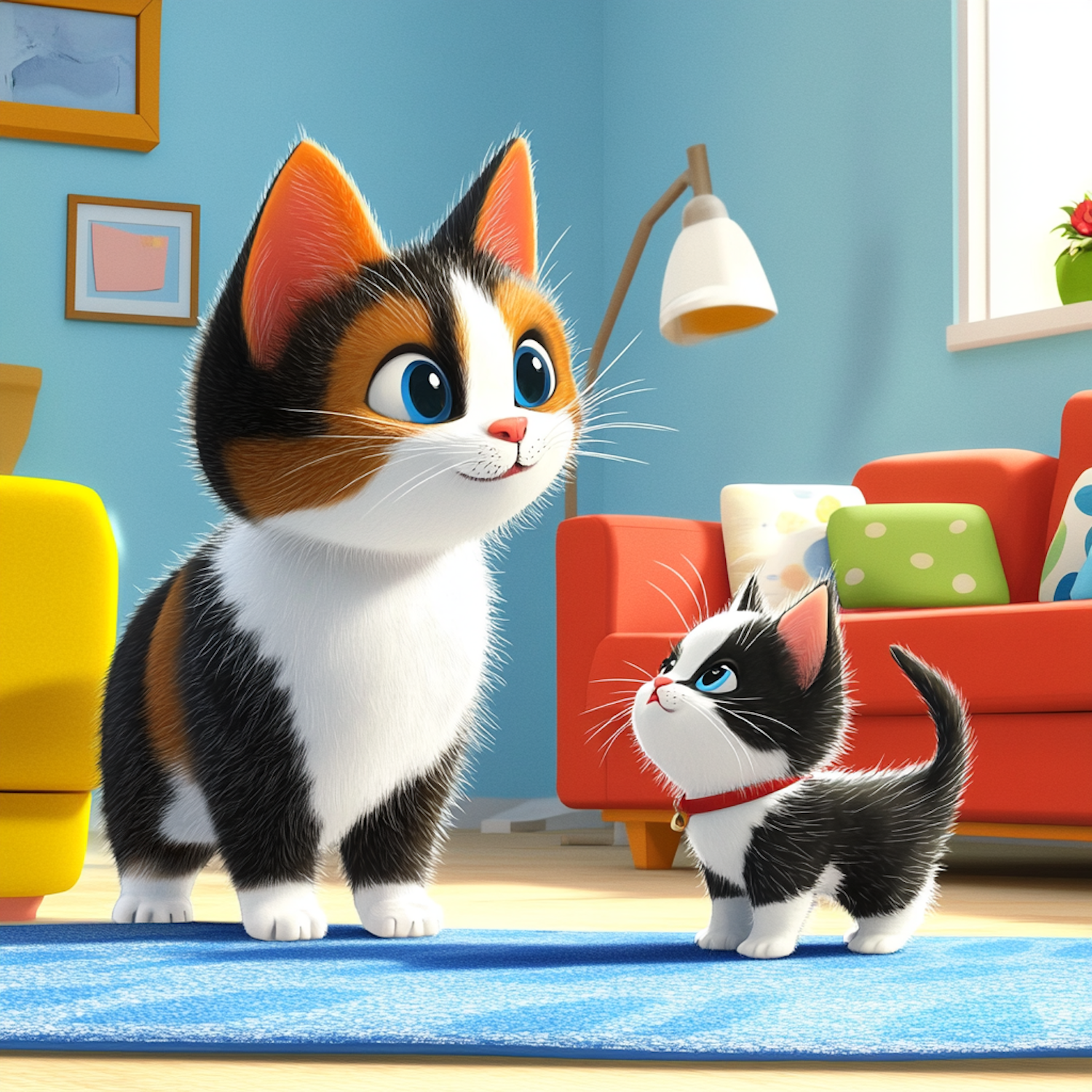 Adorable cartoon cats in a colorful room, featuring a calico and a black-and-white kitten on a blue rug.