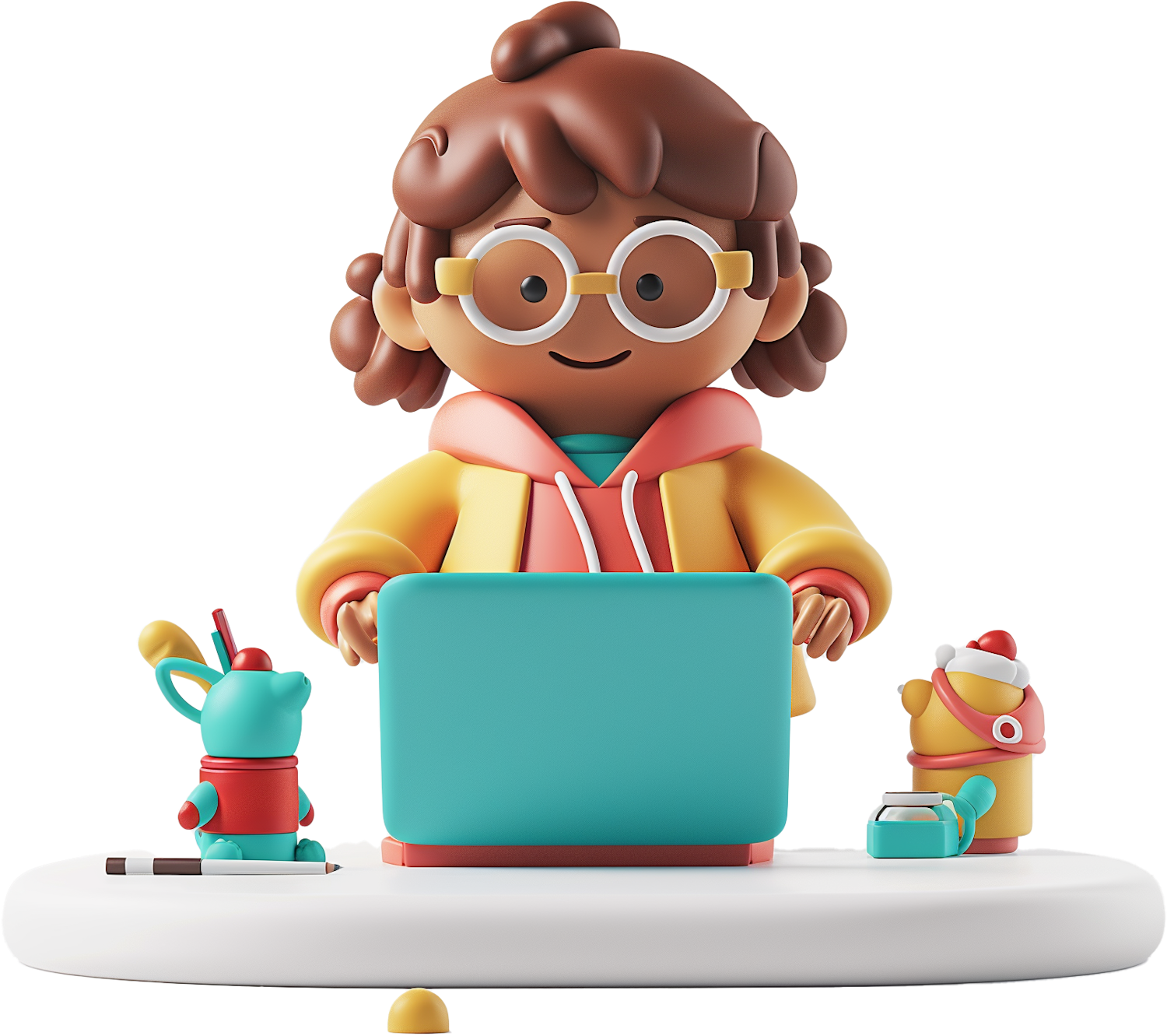 Cartoon character with glasses using a teal laptop, surrounded by playful toy figures on a white platform.