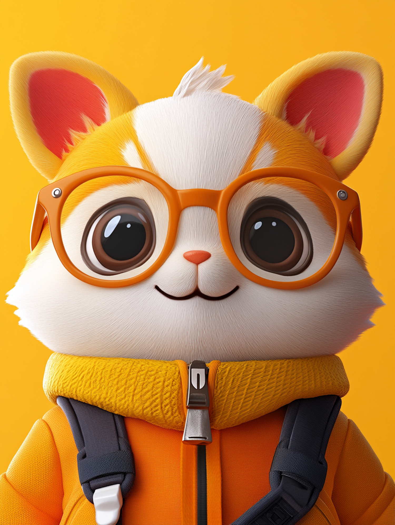 Adorable cartoon cat with orange glasses and jacket on a vibrant yellow background, exuding charm and playfulness.
