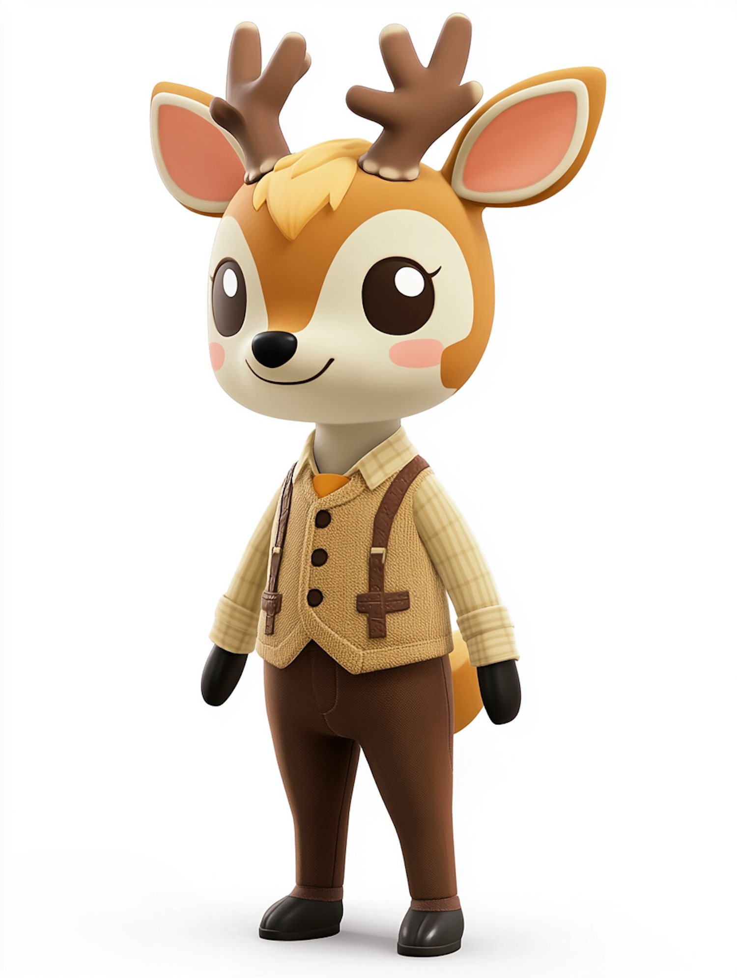 Adorable cartoon deer character with antlers, wearing a vintage outfit with suspenders, set against a plain white background.