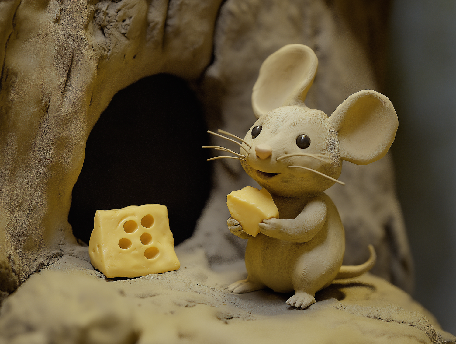 Adorable claymation mouse holding cheese in front of a cave, with a larger Swiss cheese piece nearby. Whimsical and charming scene.