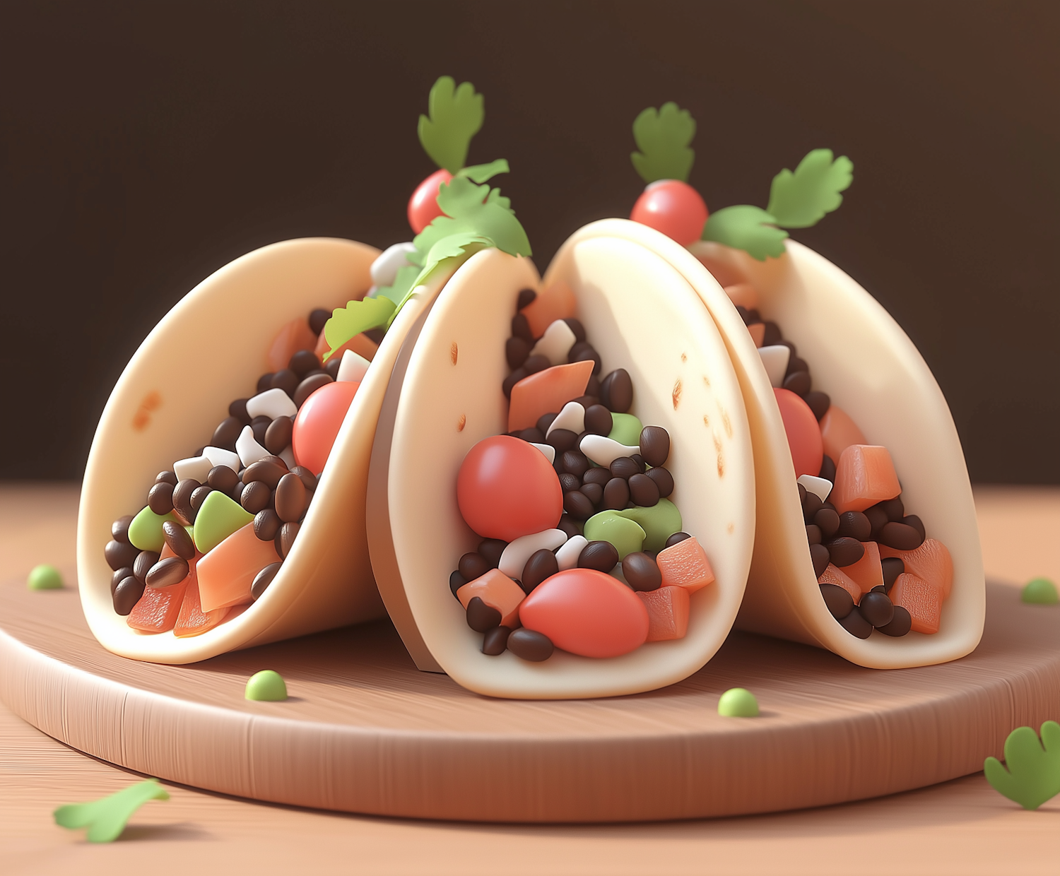 Three soft tacos filled with black beans, cherry tomatoes, carrots, and cheese, garnished with cilantro on a wooden platter.