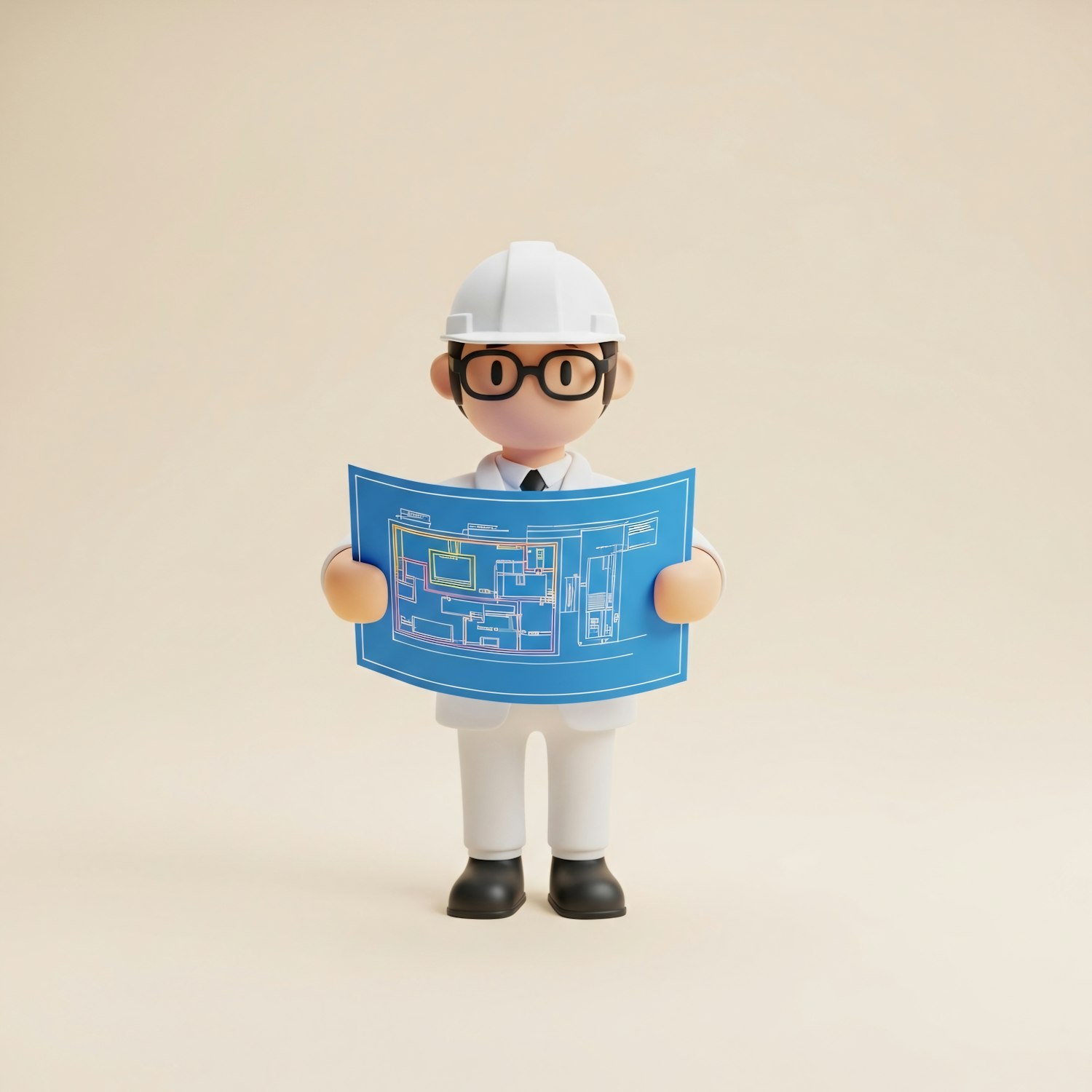 3D illustration of an architect holding a blueprint, wearing a white hard hat and glasses, set against a plain beige background.