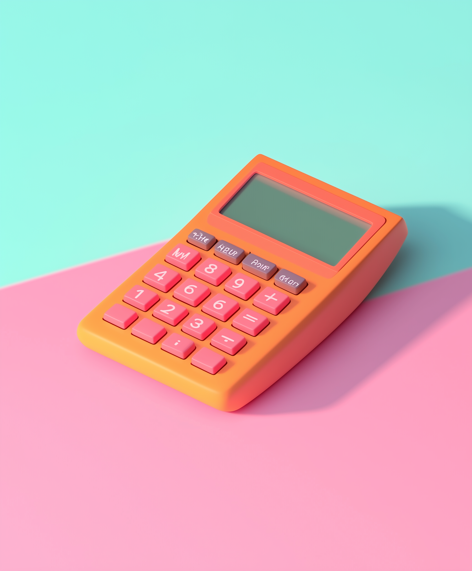 Bright orange calculator with pink buttons on a pastel pink and mint green background, creating a playful and modern aesthetic.