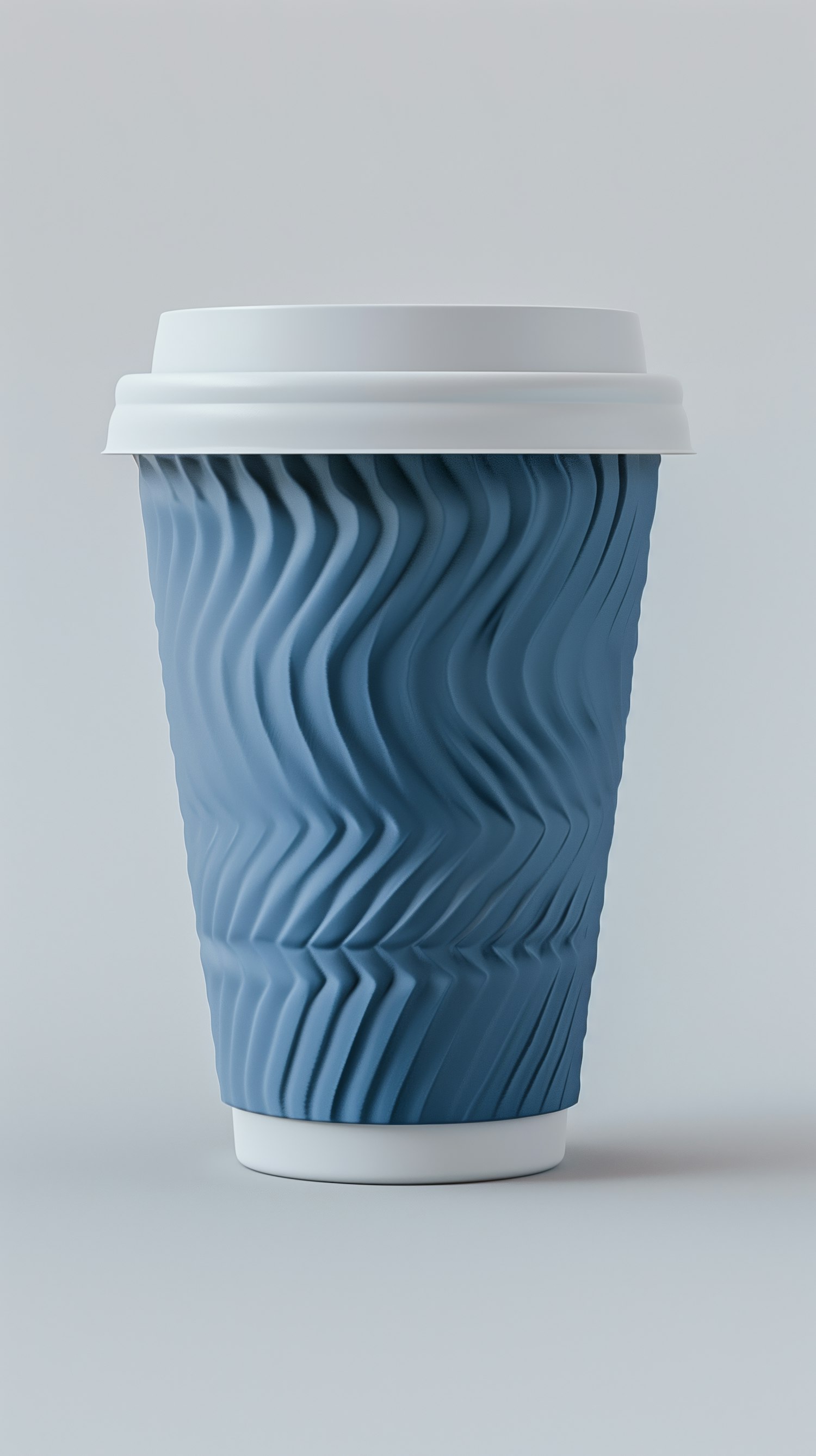 Stylish blue coffee cup with wavy texture and white lid, set against a soft gray background. Modern and minimalistic design.
