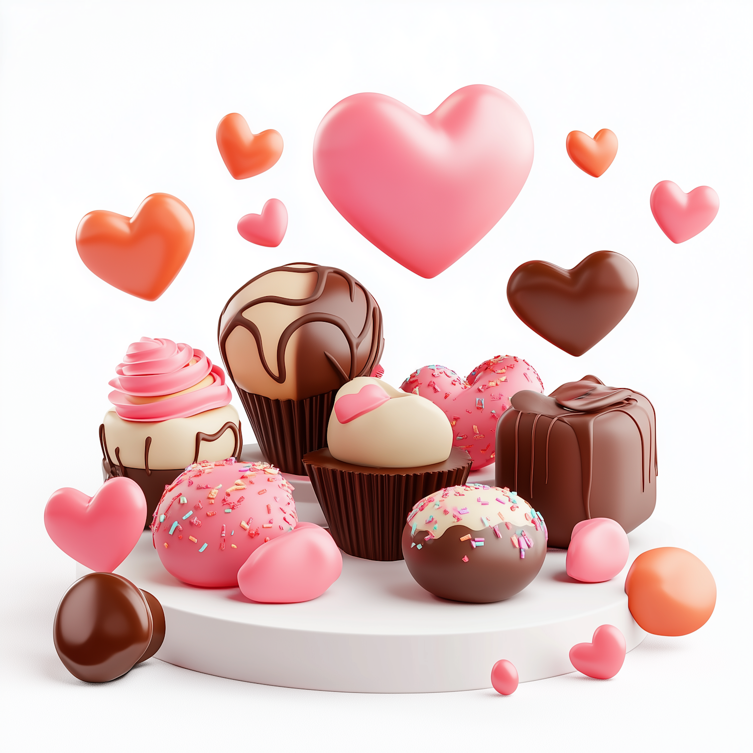 Assorted chocolates and sweets with pink frosting, sprinkles, and heart shapes, creating a romantic and festive display.