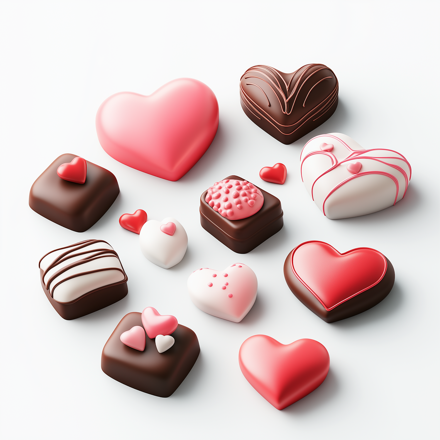 Assorted heart-shaped and square chocolates in pink, red, and brown, beautifully decorated with stripes and heart embellishments.