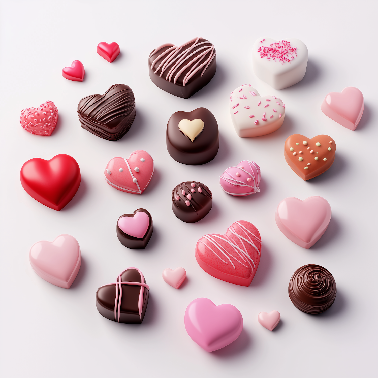 Assorted heart-shaped chocolates and candies in pink, red, and brown hues, beautifully decorated with icing and sprinkles.