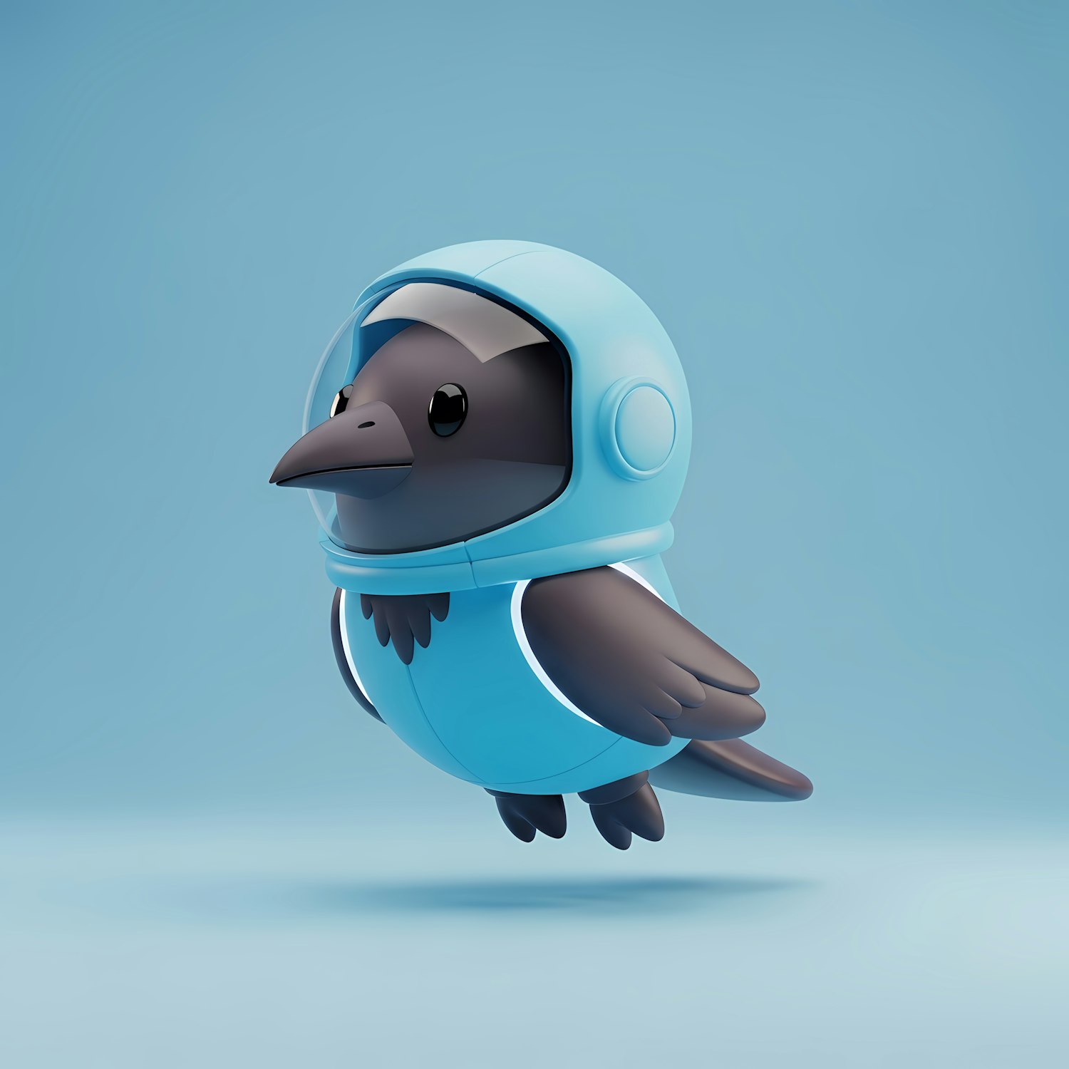 Adorable cartoon black bird in a blue astronaut suit floating in a soft blue background, perfect for space-themed designs.