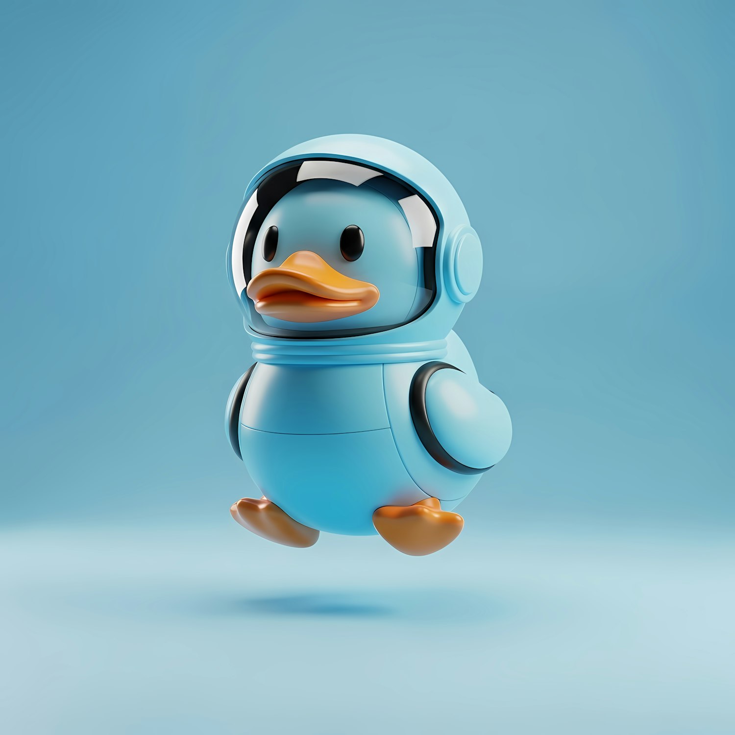 Adorable 3D duck in a blue astronaut suit floating in a light blue background. Perfect for space-themed or playful designs.