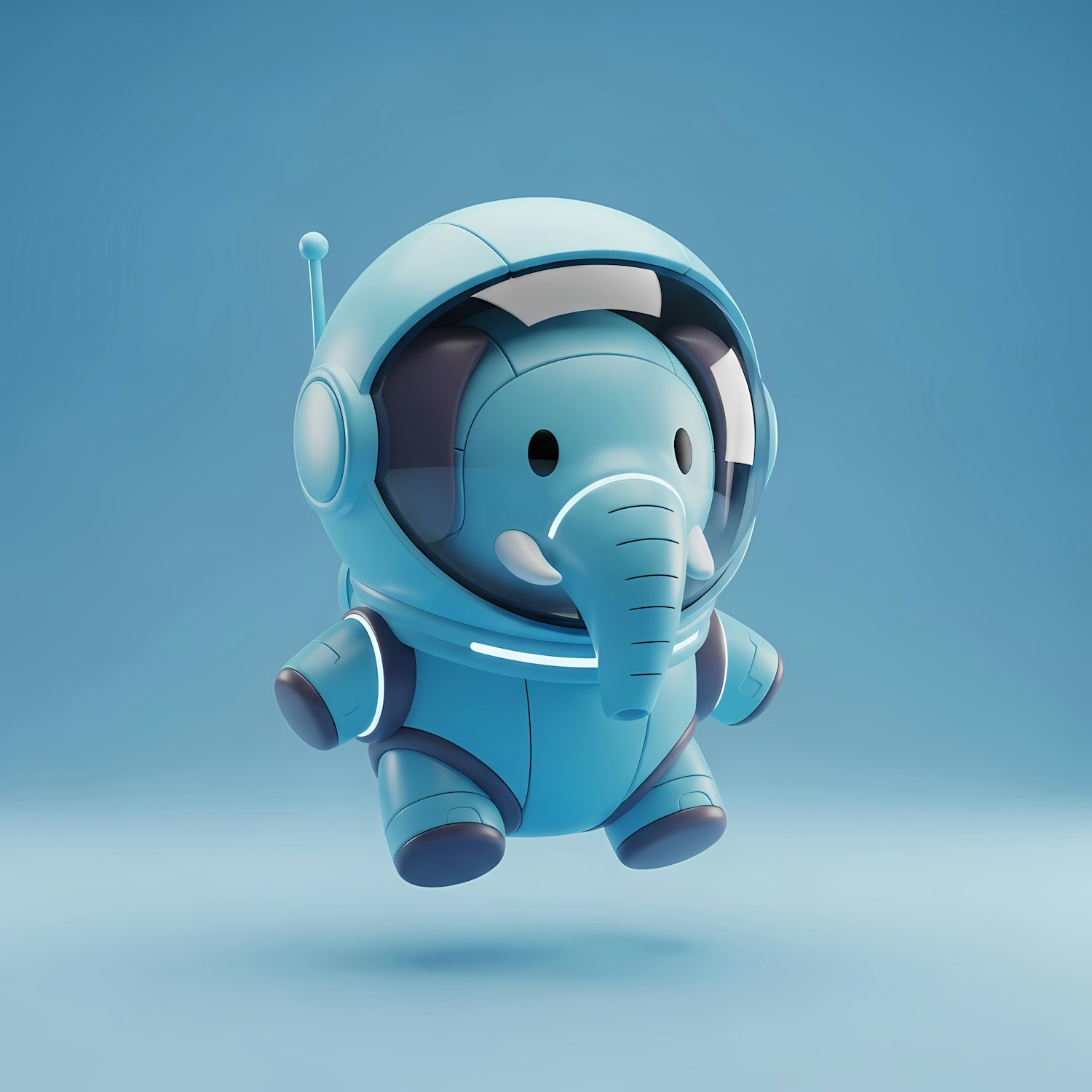 Adorable 3D elephant astronaut in a blue suit with glowing accents, floating in a serene, space-like blue background.