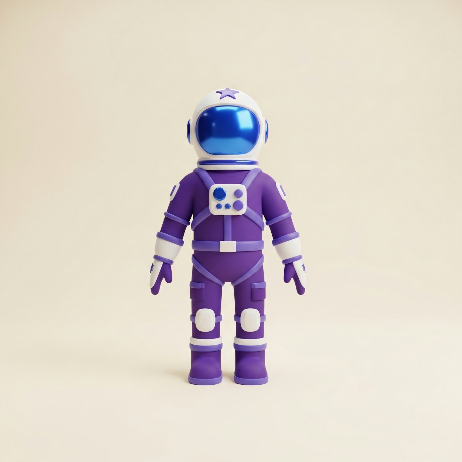 A 3D illustration of a purple and white astronaut figure with a star emblem, standing against a plain beige background.