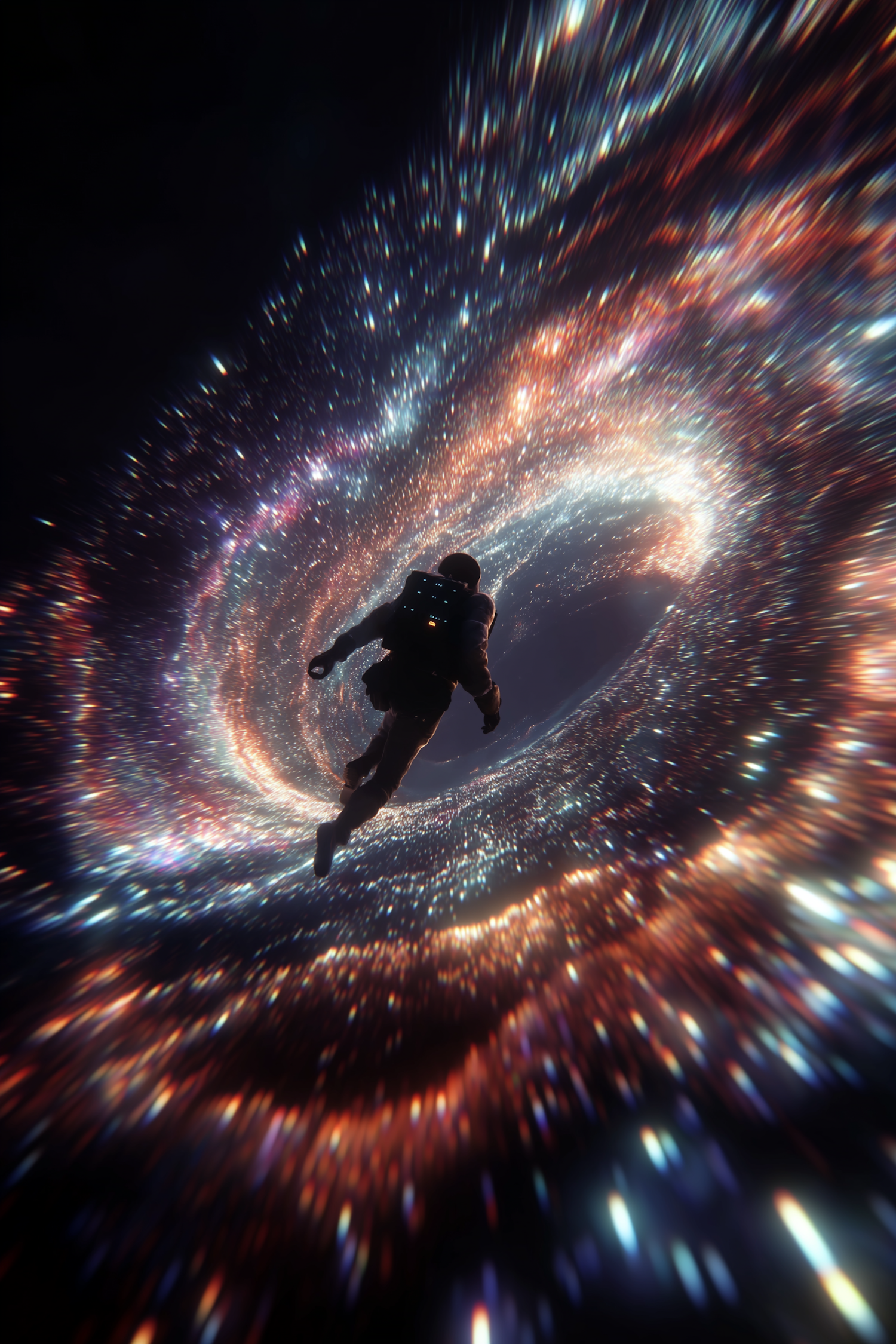 An astronaut floats towards a vibrant, swirling vortex in space, surrounded by glowing particles in a mesmerizing cosmic scene.