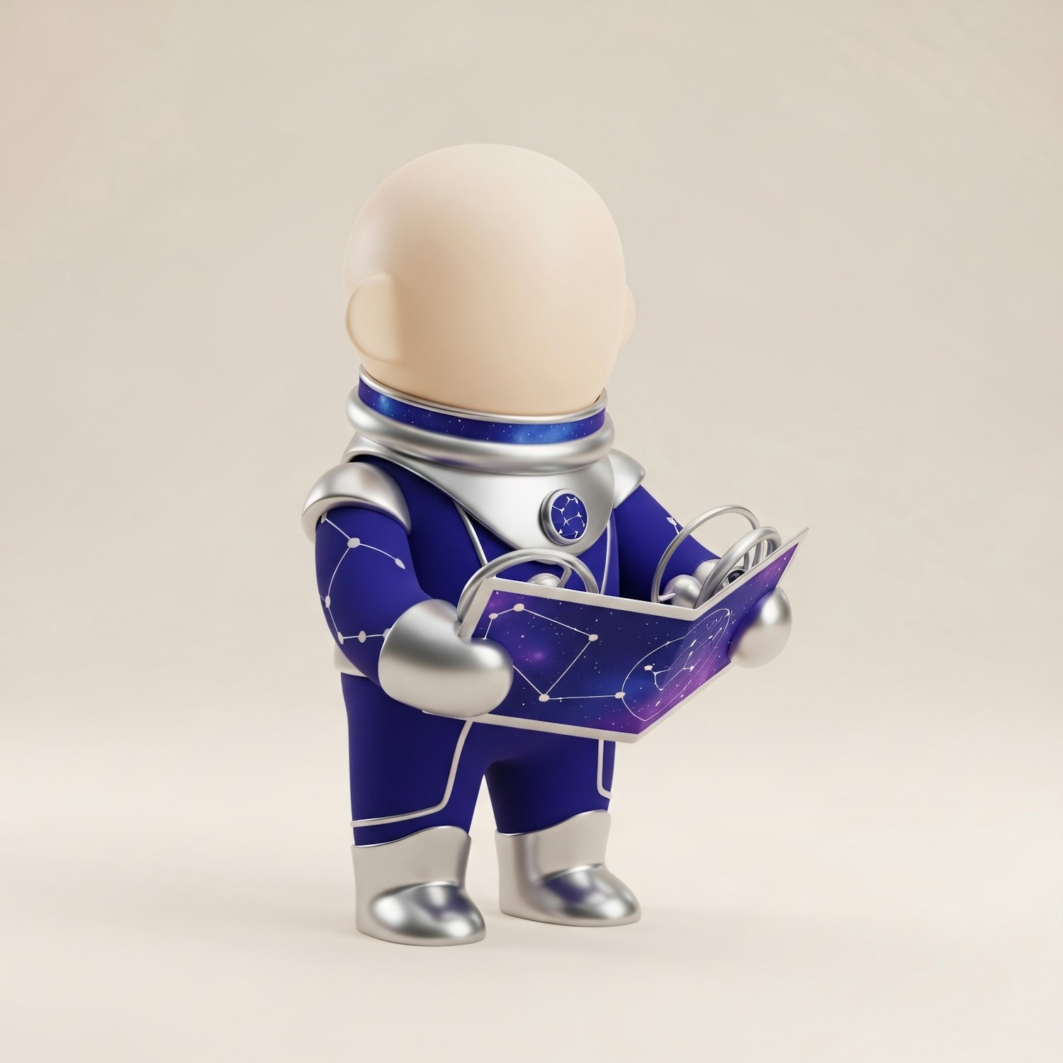 A 3D-rendered astronaut character in a blue suit with constellations, holding a star map, set against a neutral background.