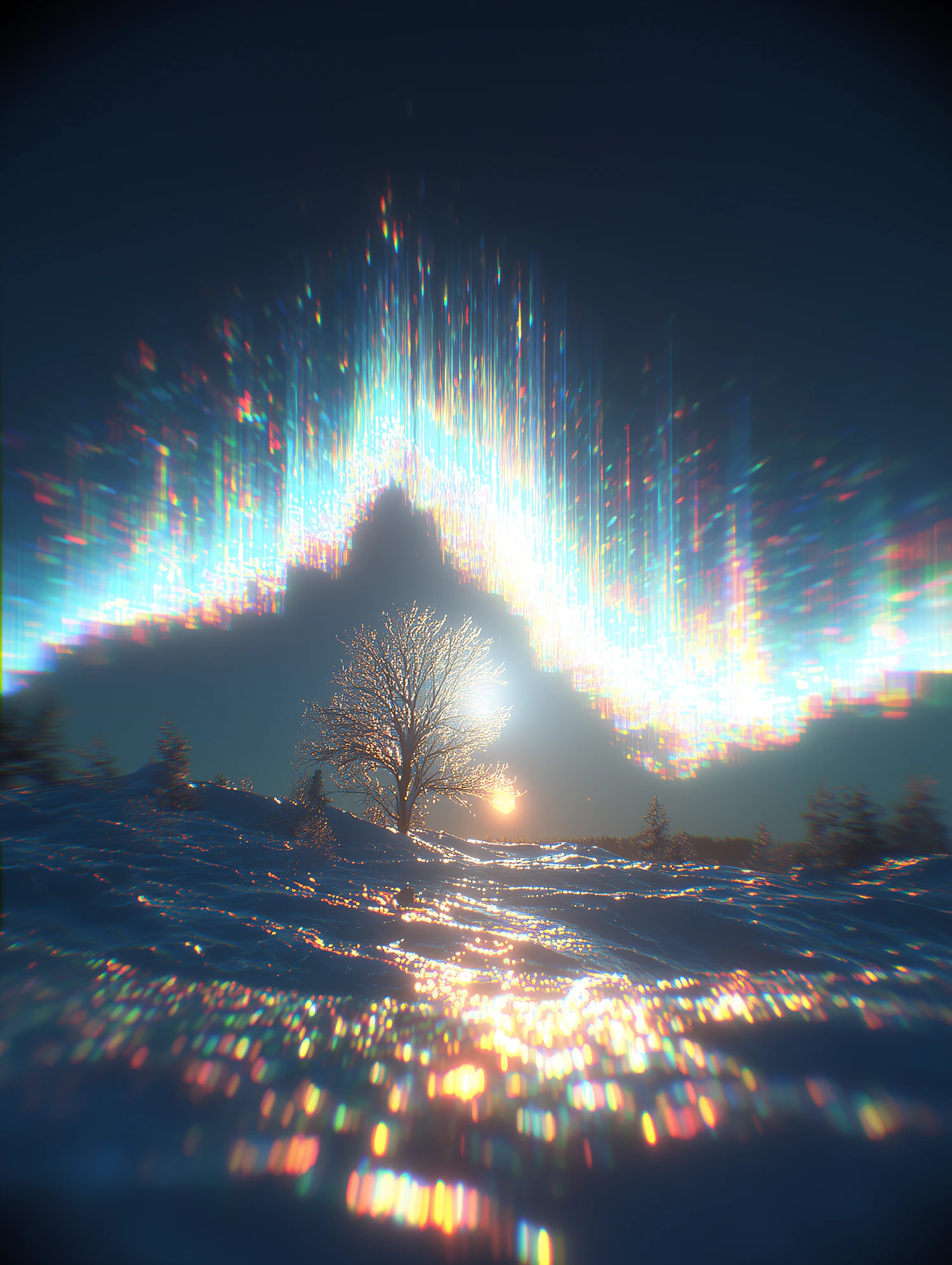 A frosty tree under a vibrant aurora in a snowy landscape, with colorful reflections creating a magical winter scene.