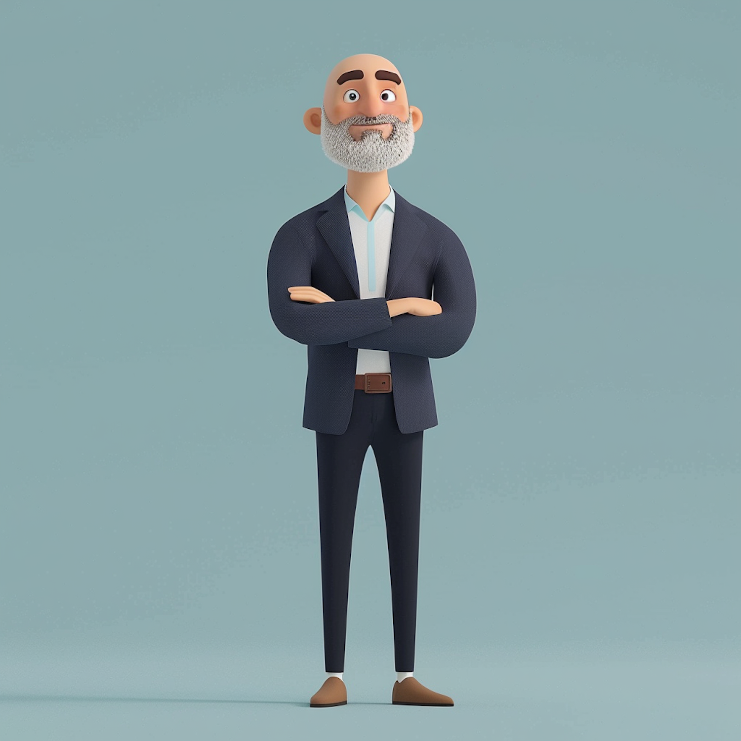Stylized 3D illustration of a bald man with a gray beard in a suit, standing confidently with arms crossed on a plain background.