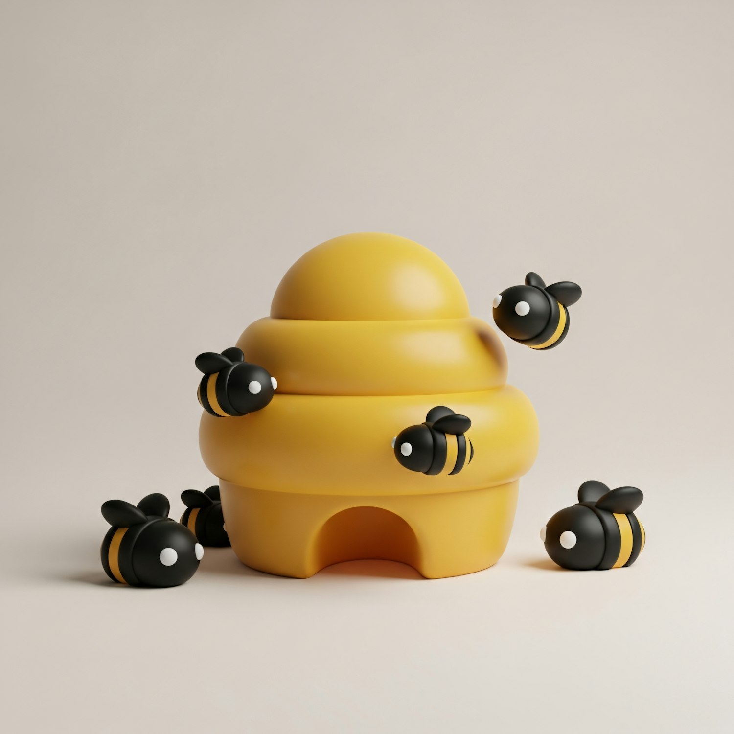 A cute illustration of a yellow beehive with cartoon bees on a beige background, perfect for children's themes or educational content.