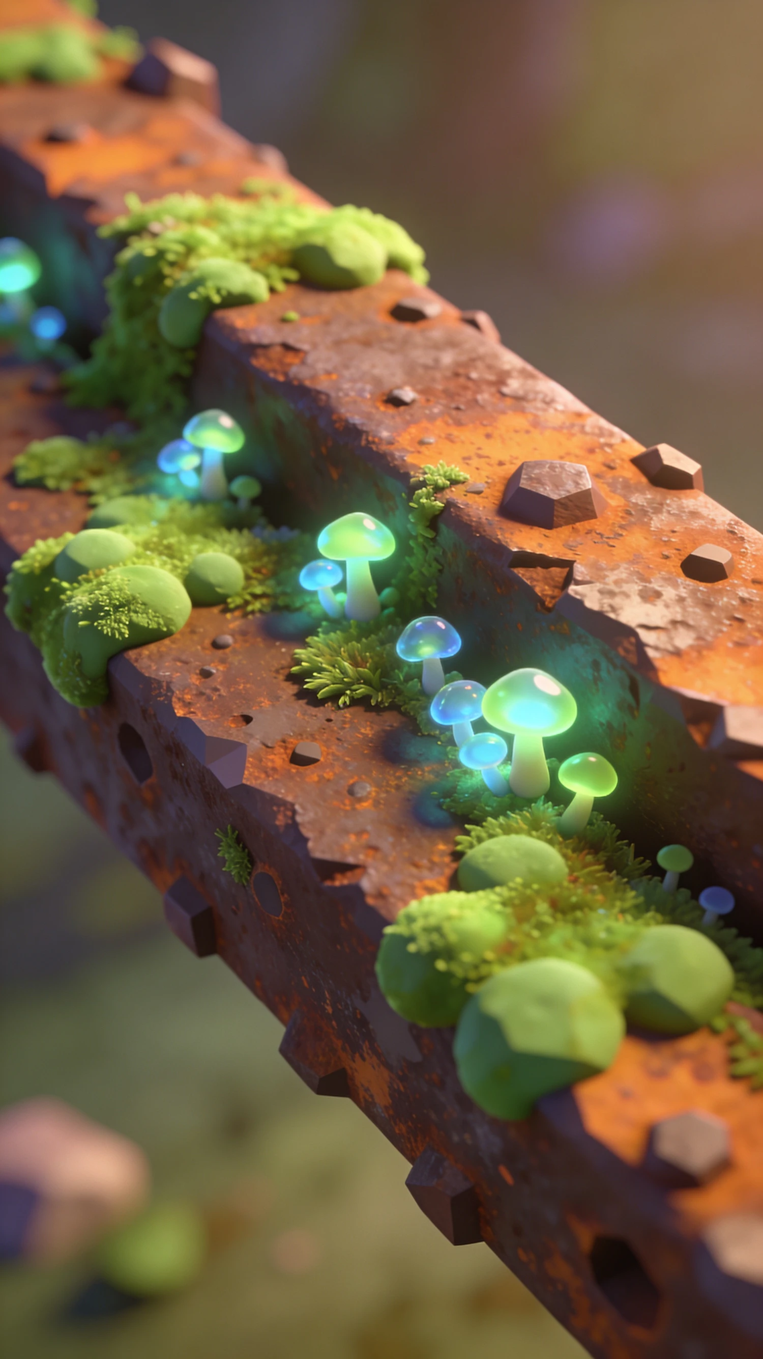 A 3D-rendered rusty beam with glowing mushrooms and moss, blending decay and life in a magical, vibrant composition.